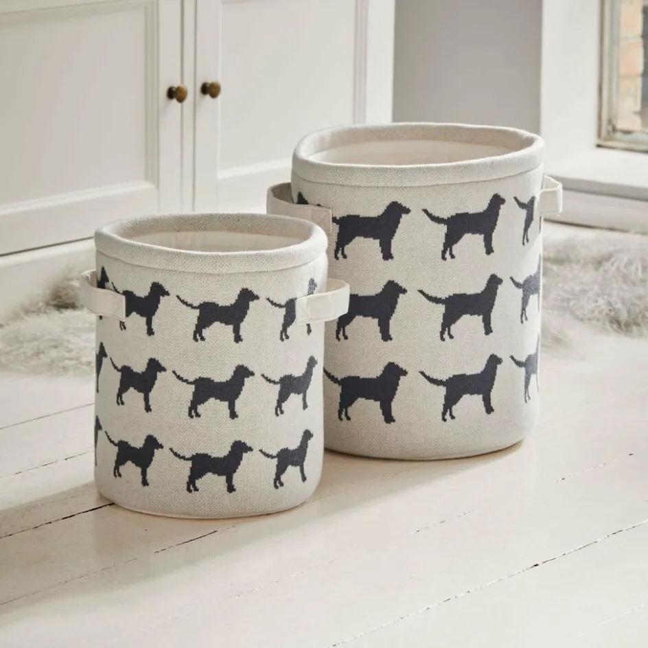 Wenn Ordnungshelfer zum Blickfang werden, dann liegt das meist an einer charmanten Idee – wie bei diesem zweiteiligen Korbset aus gestrickter Baumwolle. In warmem Creme und mit rundum eingestricktem Hundemotiv verziert, zaubern die Körbe sofort ein Lächeln ins Gesicht. Die weiche Haptik der textilen Oberfläche wird durch die klare Form perfekt ergänzt. Zwei praktische Henkel sorgen dafür, dass sich die Körbe auch voll befüllt gut tragen lassen – sei es vom Wohnzimmer ins Hundezimmer oder direkt zur Gassitasche. Ideal für Leckerlis, Hundespielzeug oder als dekorative Aufbewahrung im Flur – und ganz bestimmt ein Lieblingsstück für Hundehalter mit Sinn für Stil.