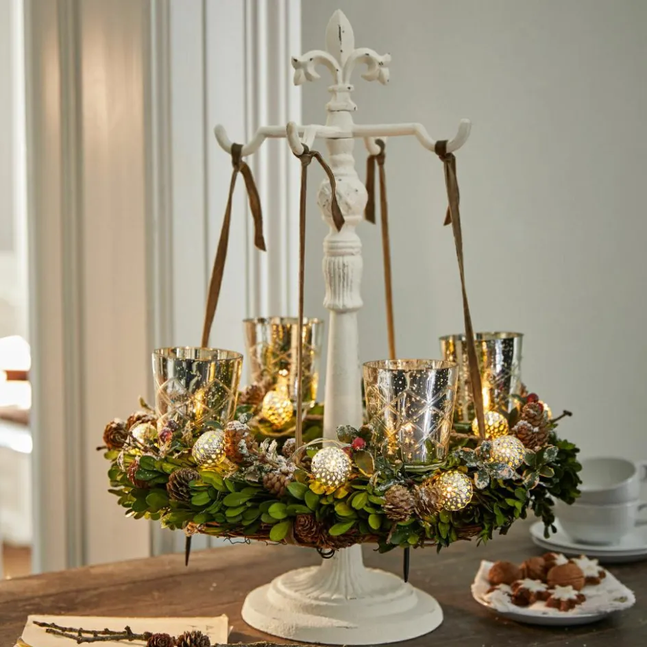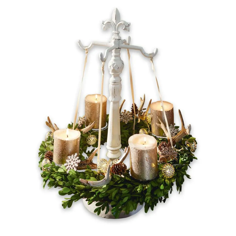 Mit diesem dekorativen Stück erheben Sie jeden Adventskranz zum Höhepunkt Ihrer Weihnachtsdekoration: Der gusseiserne Adventskranzständer punktet mit einer hochwertigen Verarbeitung, Standfestigkeit und einem rundum klassischen Design. Aufgehängt an dem handbearbeiteten Gestell, wird jeder noch so schlichte Kranz zu einem echten Hingucker. Praktisch: Die Spitze in Form einer Lilie lässt sich abschrauben, das 4-armige Gestell vom Sockel abnehmen, so müssen Sie den Kranz nicht schwebend an den Halterungen befestigen.