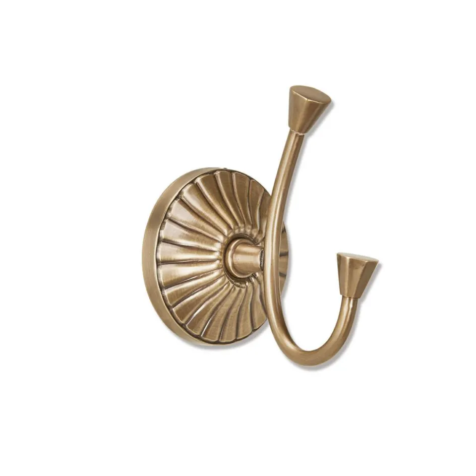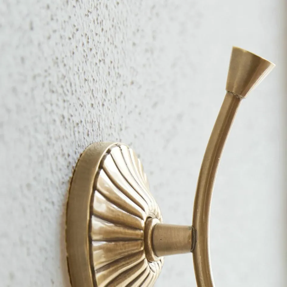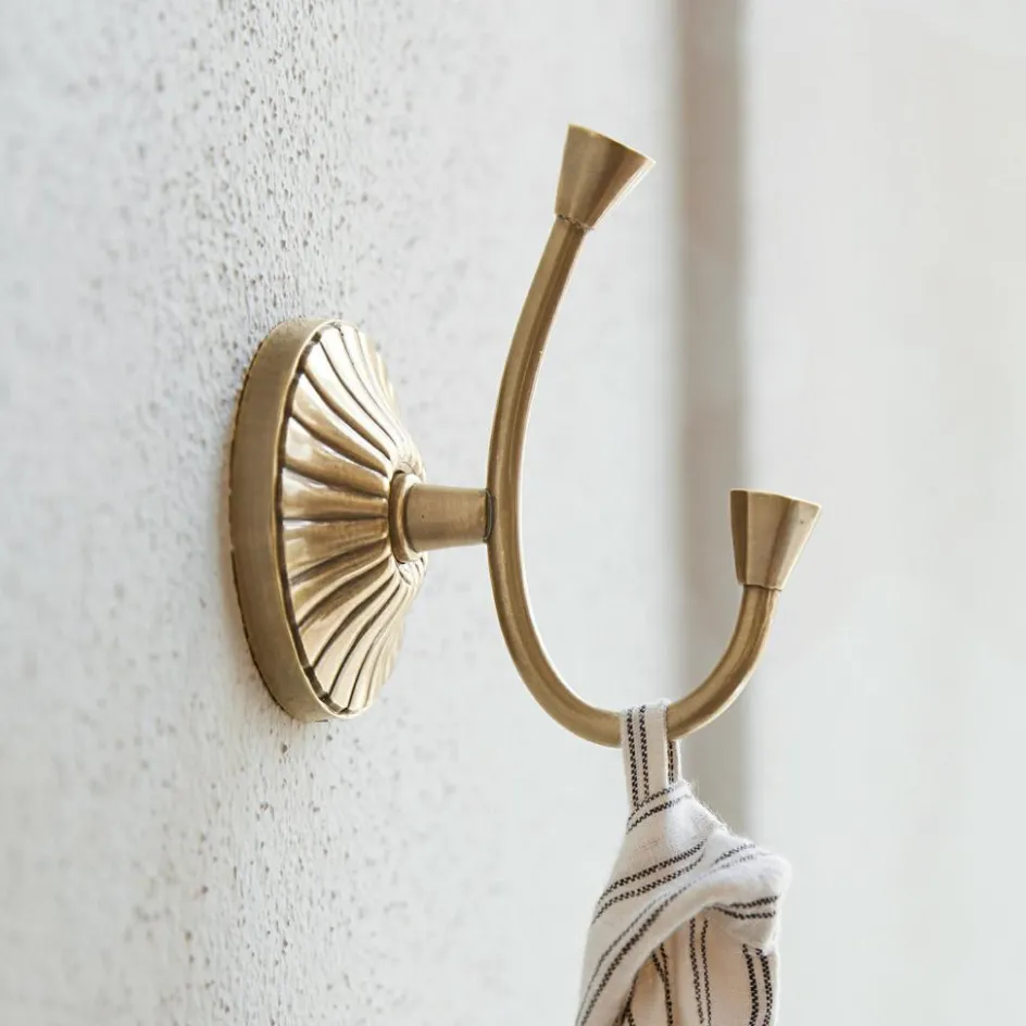 Dieses antik-veredelte Schuckstück aus reinem Messing erlaubt eine unkomplizierte Wandmontage – die dafür benötigten Schrauben werden selbstverständlich mitgeliefert. Die gerillte Oberfläche ist der Schale von Jakobsmuscheln nachempfunden und harmoniert bestens mit dem dunklen Vintage-Finish. Smart: Um das Gewebe ihrer Textilien zu schonen, wurden die Hakenenden abgeflacht.