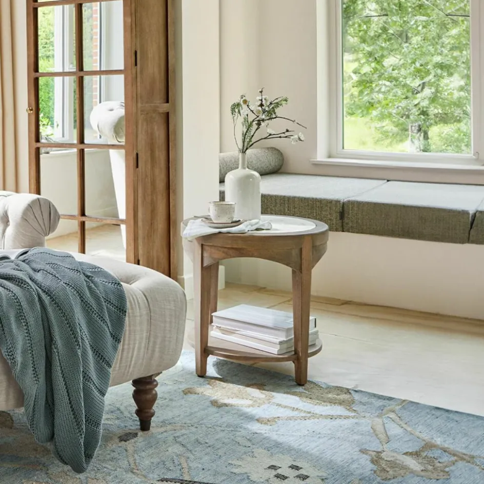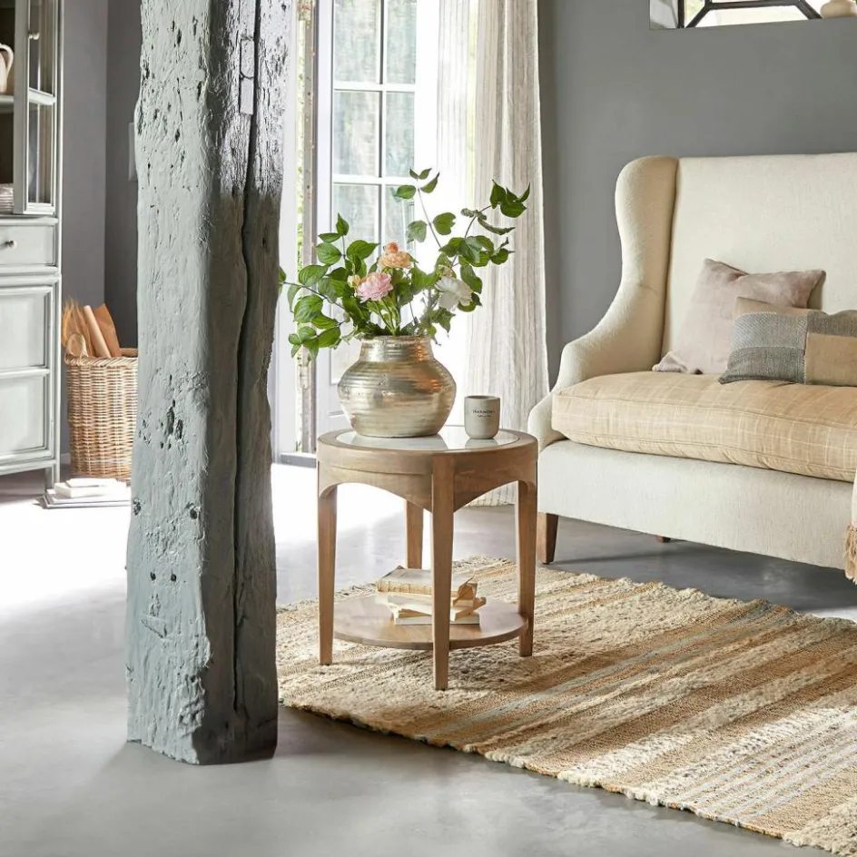 Ein handgetischlertes Gestell aus massivem Mangoholz und obenauf eine edle Marmorplatte – mit einer äußerst gelungenen Materialkombination verlockt dieser runde Beistelltisch. Die natürliche Maserung des Marmoreinsatzes variiert bei jedem Modell, was aus jedem Tisch ein Unikat macht. Unter der Tischplatte bietet sich eine weitere kleine Ablagefläche für Zeitschriften, Bücher oder sonstige Dinge an. Ein wohnliches Beistellmöbel, das mit dem französischen Vintage-Chic, aber auch mit klassischen Landhaus-Einrichtungen bestens harmoniert – ob im Wohnzimmer neben dem Sofa, im Schlafzimmer neben dem Bett oder im Esszimmer als praktischer Begleiter neben der Gästetafel.