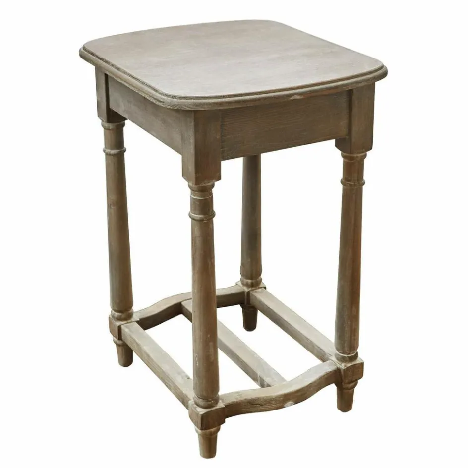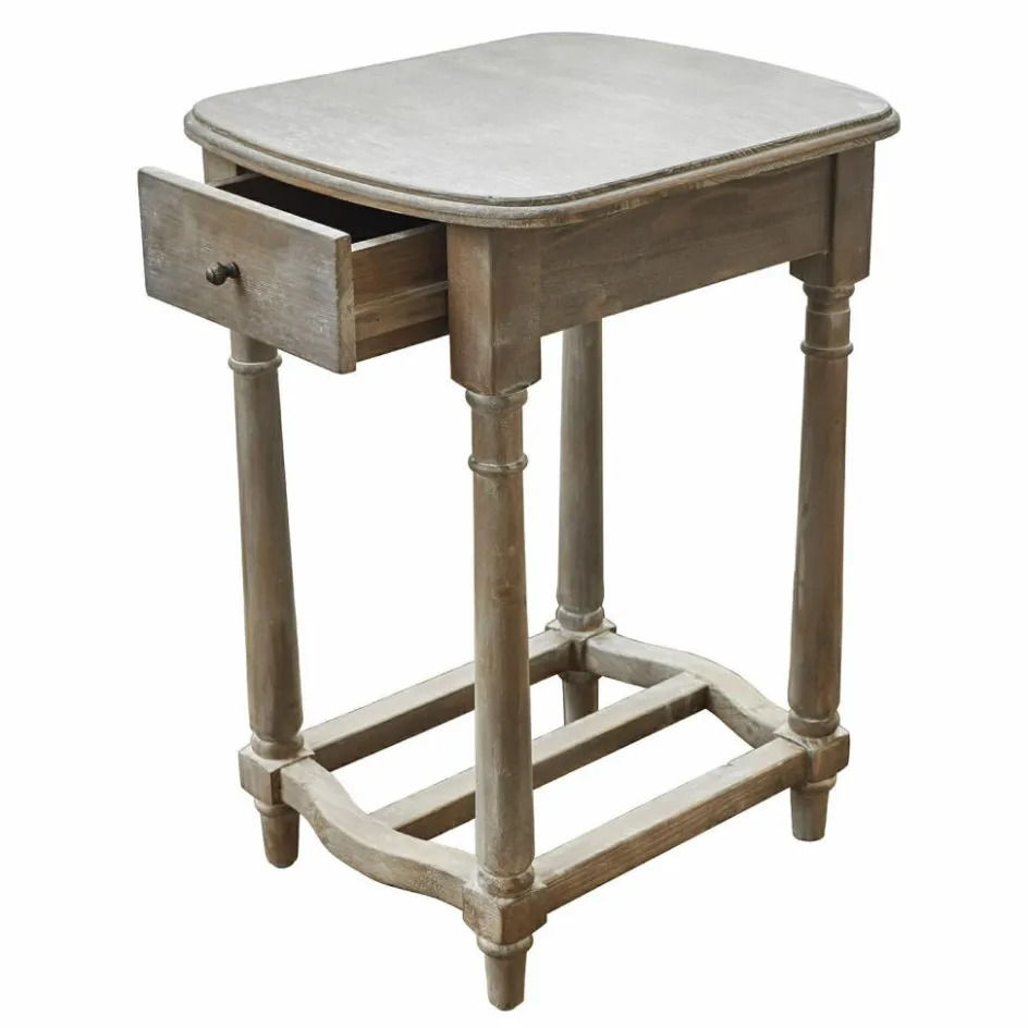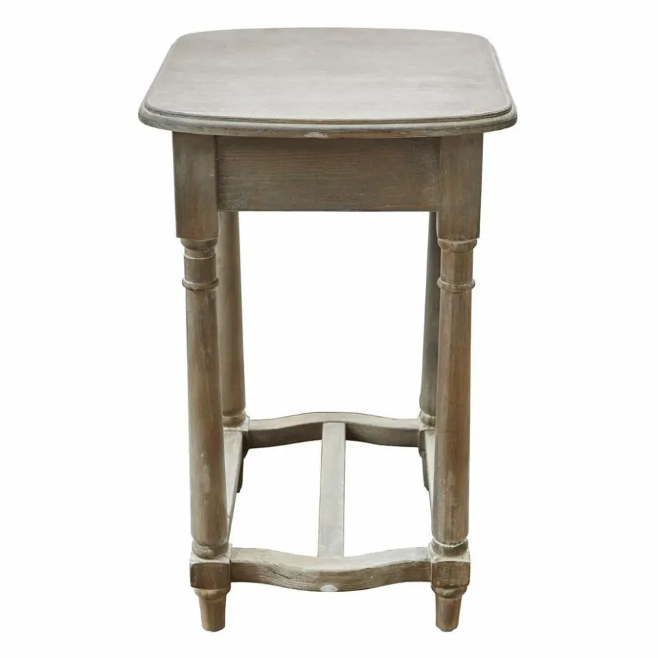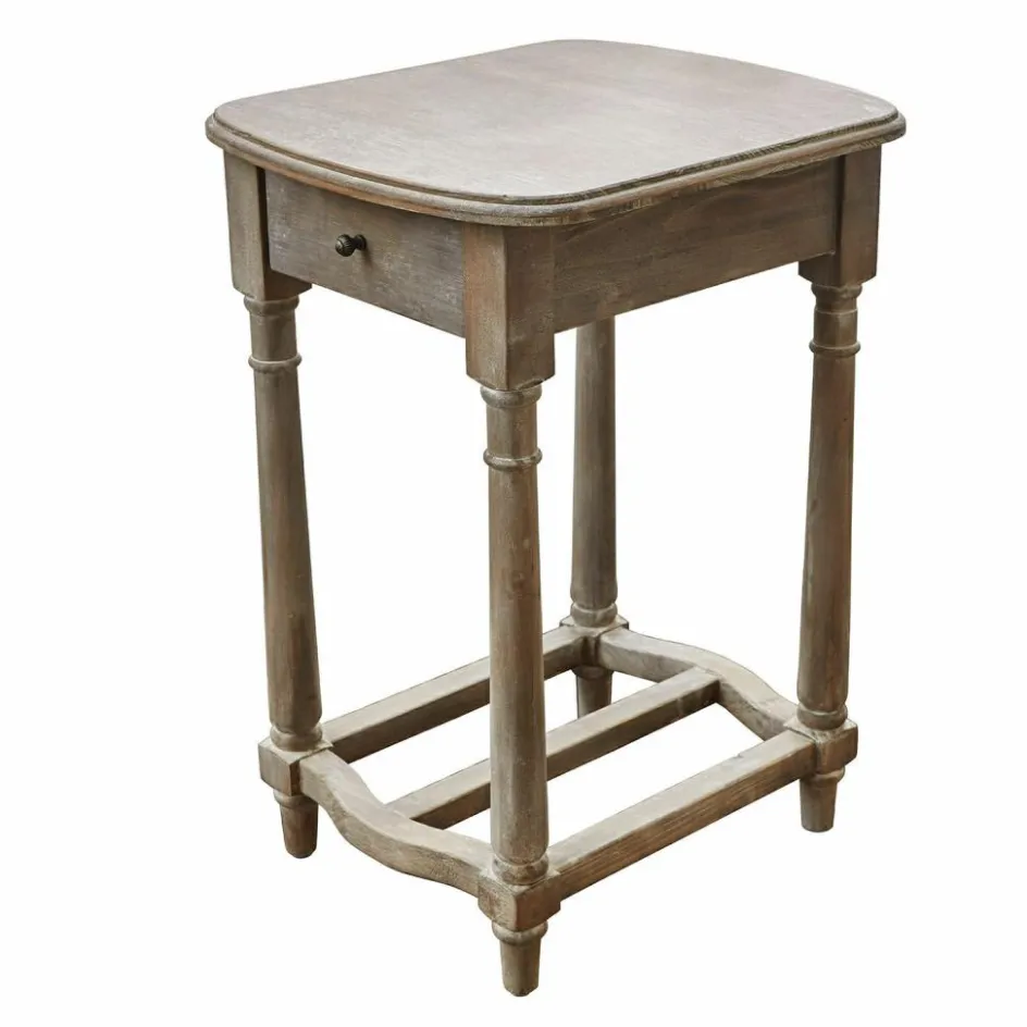 Oft sind es die kleinen Dinge, die das Wohnglück perfekt machen. Eine Pflanze hier, ein Tischchen dort und schon bekommt das Ambiente eine individuelle Note. Dieser Beistelltisch präsentiert sich im charmanten Landhaus-Look mit stiltypischen Details und in einem verwitterten Grauton, der wunderschön mit seinem verträumten Charakter harmoniert. Der Beistelltisch ist aber mehr als ein kleines Schmuckstück: Seine Platte bildet eine stilvolle Ablagefläche für eine Lampe, eine Blumenvase, Kerzen oder, oder, oder, in der Schublade können diverse Kleinigkeiten verstaut werden. Was man dem Beistelltisch auf den ersten Blick nicht ansieht: Er wurde sorgfältig von Hand aus massivem Kiefernholz gefertigt und kann mit einem Gewicht bis zu 25 kg belastet werden, obwohl das Tischchen selbst nur 4 kg wiegt.
