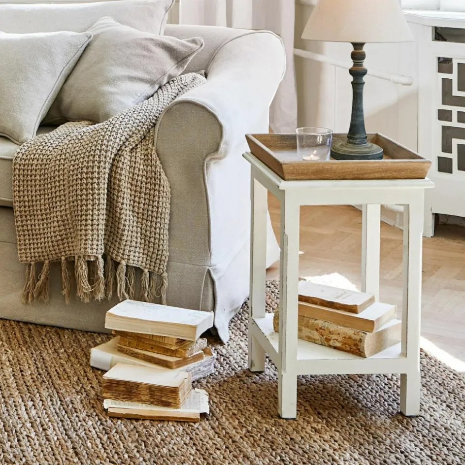 Eine spannende Kombination, reizvoll und komfortabel zugleich: Hier vereinen sich ein schicker Beistelltisch und ein schönes Tablett mit stilvollem White-Washed-Effekt. Ein Handgriff und die schmucke Abstellfläche bietet Ihnen Kaffee, Tee oder andere Getränke und Speisen aller Art, wo auch immer Sie sich befinden. Denn das Duo hat ein kleines Geheimnis: Das Tablett ist abnehmbar, sodass Sie Ihr Frühstück direkt im Bett oder zum Beispiel auch im Liegestuhl auf der Terrasse genießen können. Durch einen speziellen Einsatz ist es auf dem Tisch fixierbar und verrutscht nicht, sodass Missgeschicke praktisch ausgeschlossen sind. Die hochwertige Fertigung von Hand und die natürliche Mangoholzmaserung lassen dieses feine Ensemble zum kleinen Kunstwerk werden. Freuen Sie sich auf viele schöne Momente mit diesem vielseitigen Begleiter.