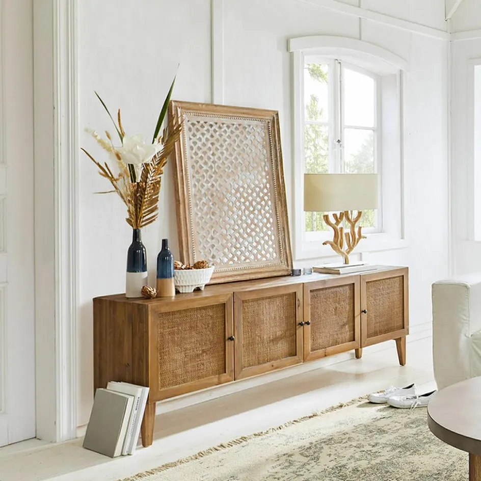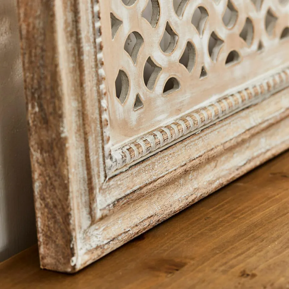 Genießen Sie ein Dekoobjekt von ganz besonderem Charme. Eine gelungene Mischung aus orientalischem Stil und Landhaus-Anklängen macht dieses Wandbild zu einem einzigartigen Blickfang. Die Gestaltung steht für hochwertige Handwerksarbeit – innen eine Hartfaserplatte mit stilistisch schönem Musterbild und raffinierten Aussparungen, außen ein breiter, kunstvoll verzierter Rahmen aus massivem Mangoholz. Für den trendigen Shabby-Chic wurde das Bild mit einem White-Washed-Finish veredelt. Ein außergewöhnliches Unikat, das sich durch vier Metallhaken auf der Rückseite vertikal oder horizontal an die Wand hängen lässt. Seine Wirkung entfaltet es in einem maritim angelehnten Ambiente genauso fantastisch wie in Einrichtungen im Ethno-Look oder Vintage-Style.