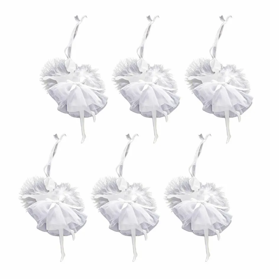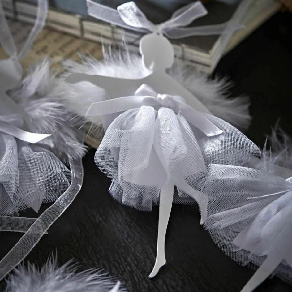 Diese sechs filigranen Anhänger wirken, als wären sie direkt einem winterlichen Ballett entsprungen. Jede Figur ist aus fein lackiertem Eisen gefertigt und trägt ein luftig leichtes Tütü aus zartem Tüll, das bei jedem Luftzug leicht schwingt. Die schimmernden Organzabänder und die kleinen, echten Federn, die als Flügel dienen, unterstreichen den ätherischen Charakter der Ballerina-Engel. Ob an einem festlich geschmückten Baum, an der Fensterdekoration oder als charmanter Blickfang an einem Adventskranz – sie verleihen Ihrer Dekoration einen Hauch von Poesie, Leichtigkeit und verträumtem Weihnachtszauber.