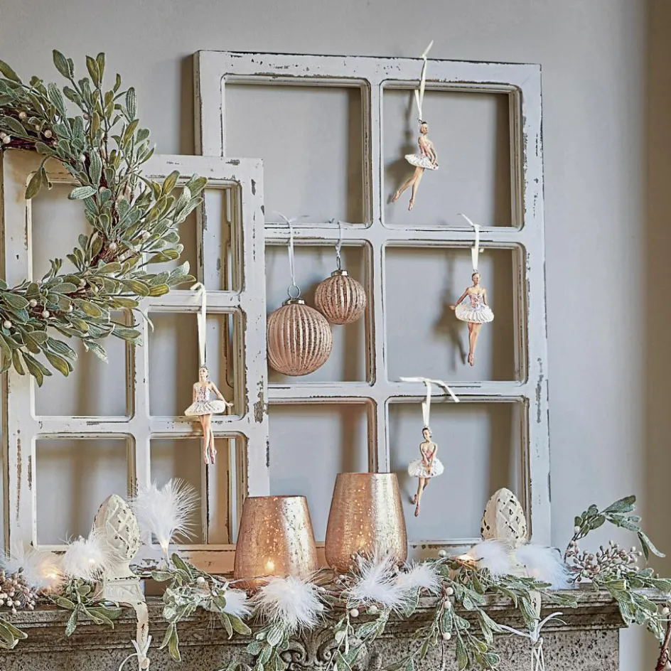 Vier entzückende kleine Ballerinen, die schwerelos in der Luft hängend ihre Pirouetten drehen. Im Set sind Figuren in zwei verschiedenen Posen enthalten. Ob an der Weihnachtstanne oder an anderer Stelle: sie zaubern einen Hauch Romantik und Nostalgie in jeden Raum. Einfach perfekt zum Shabby-Chic. Die verträumten Figürchen erinnern an die 40er Jahre. Sie bestehen aus Polyresin und sind liebevoll handbemalt. Die Augenbrauen sind fein geschwungen, die roten Münder gespitzt. Die Corsage zieren wunderschöne Details, und man kann sogar die Stofflagen der Tüllröcke erkennen. Glitzernde Elemente funkeln schön im Kerzenlicht. Bis hin zu den schimmernden geschnürten Ballettschühchen sind sie wirkliche kleine Meisterwerke, die nicht nur zur Weihnachtszeit einen ganz besonderen Zauber versprühen.