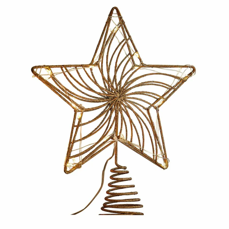Verleihen Sie Ihrem Weihnachtsbaum eine glamouröse Krönung mit dieser funkelnden LED-Baumspitze. Das goldfarbene Glitzer-Finish strahlt Eleganz und Festlichkeit aus, während die 20 warmweißen LEDs sanft leuchten und für eine behagliche Atmosphäre sorgen. Das kunstvoll gefertigte Drahtdesign bringt eine filigrane Note in Ihre Dekoration und zieht alle Blicke auf sich. Ob im Wohnzimmer oder im festlich geschmückten Eingangsbereich, diese Baumspitze ist ein echter Hingucker. Sie verspricht Ihnen viele Jahre Freude an Ihrer Weihnachtsdekoration. Lassen Sie sich von dem warmen Licht und dem funkelnden Glanz verzaubern und genießen Sie die festliche Stimmung in vollen Zügen.