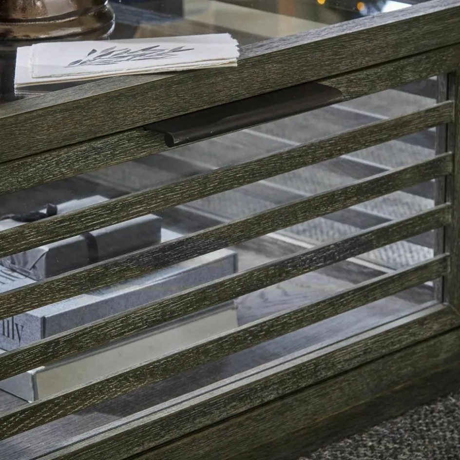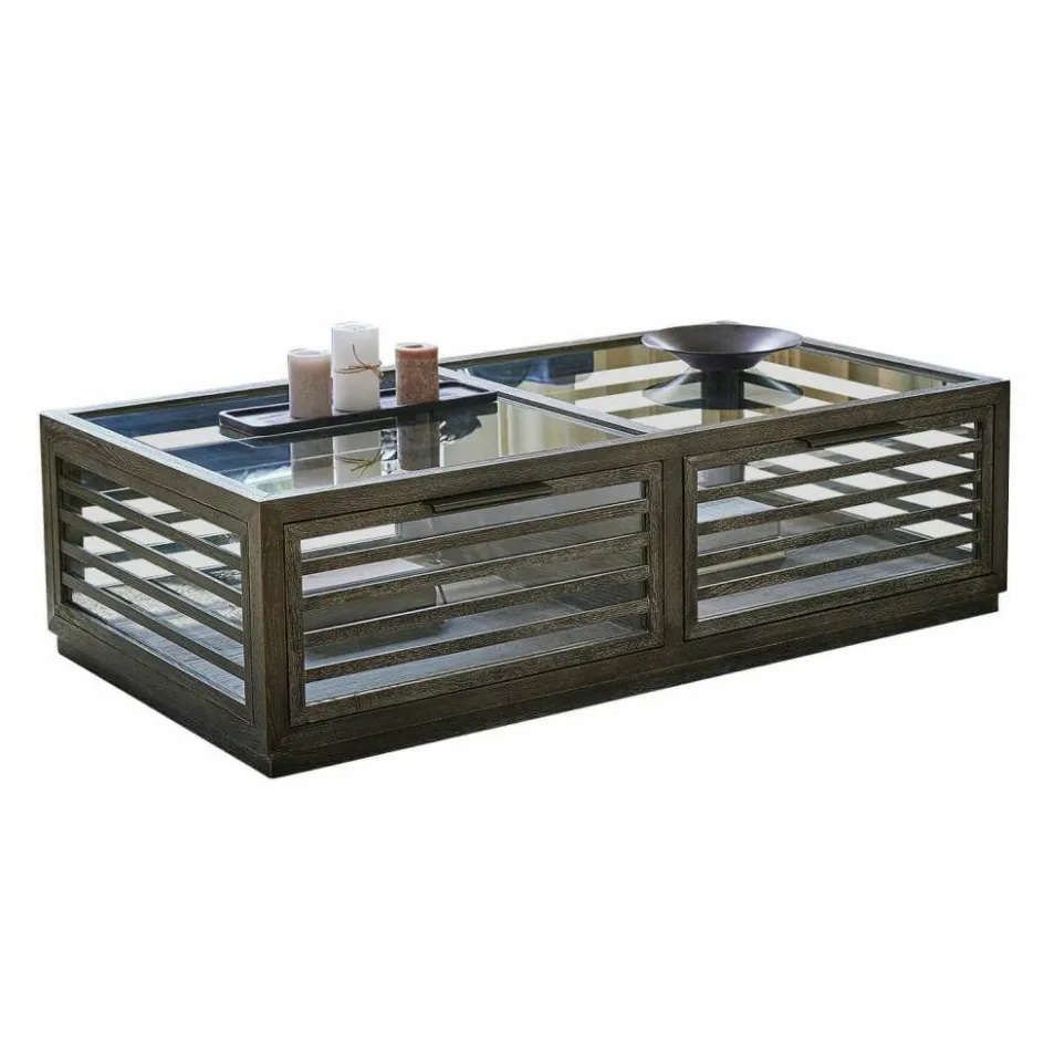 Geradlinig, durchdacht und dennoch raffiniert: Dieser Couchtisch aus Eichenholz begeistert mit seinem klaren Aufbau und der spannenden Materialkombination. Die umlaufenden Lamellen in dunklem Holzrahmen erzeugen ein Spiel aus Licht und Schatten, während Glasflächen oben und unten dem Tisch eine luftige Anmutung verleihen. Besonders clever gelöst sind die vier seitlich zu öffnenden Klapptüren, die nicht nur ästhetisch in das Design integriert sind, sondern auch wertvollen Stauraum eröffnen. Im Inneren lassen sich dekorative Lieblingsstücke ebenso schön inszenieren wie Alltagsdinge ordentlich verstauen. Ein Tisch, der nicht nur funktional überzeugt, sondern das Wohnzimmer auch visuell bereichert.