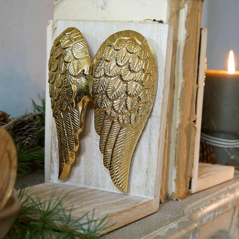 Engelsflügel – ein Symbol für Schutz, Leichtigkeit und Inspiration. In diesem Buchstützen-Set werden sie zum strahlenden Blickfang auf jedem Regal oder Beistelltisch. Die Flügel aus goldfarbenem Aluguss beeindrucken durch ihre feine Reliefstruktur und schimmern je nach Lichteinfall in sanftem Glanz. Das helle Mangoholz mit White-Washed-Finish bildet dazu einen ruhigen, natürlichen Kontrast und lässt die Flügel fast schweben. Ob in einem meditativen Lesebereich, als poetisches Detail im Wohnzimmer oder als Geschenkidee für Herzensmenschen – dieses Set hebt Ihre Lieblingsbücher in besonderer Weise hervor.