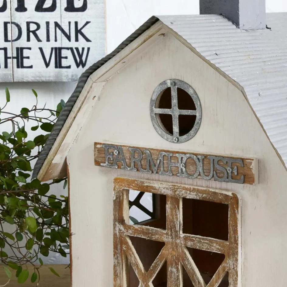 Das charmante Farmhaus begeistert mit handgearbeiteten Elementen und raffinierten Details. Bei der Herstellung kommen unter anderem Tannenholz und Eisen zum Einsatz, wobei jedes Stück aufwendig veredelt und mit feinen Unregelmäßigkeiten geschmückt wird. So entsteht ein authentischer Vintage-Charakter, der jedes Exemplar zum Einzelstück macht. Die Krönung – im wahrsten Sinne des Wortes – ist ein stattlicher Hahn, der auf einer Himmelsrichtungsanzeige sitzt.