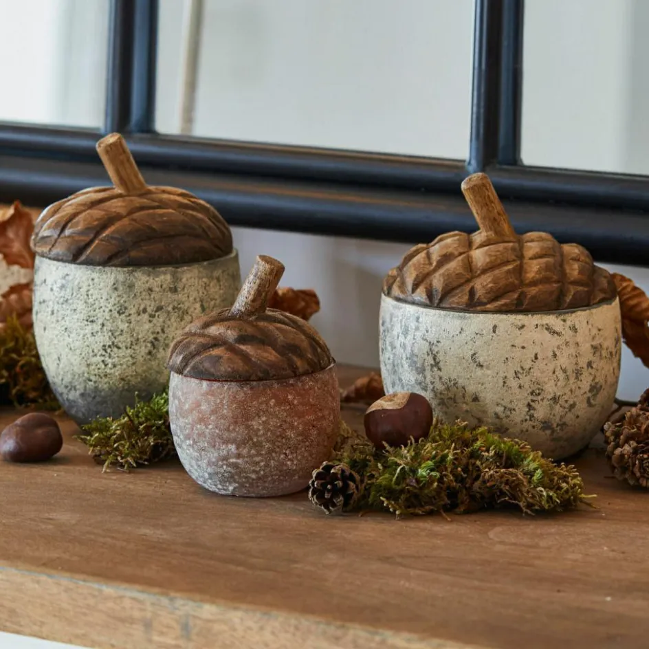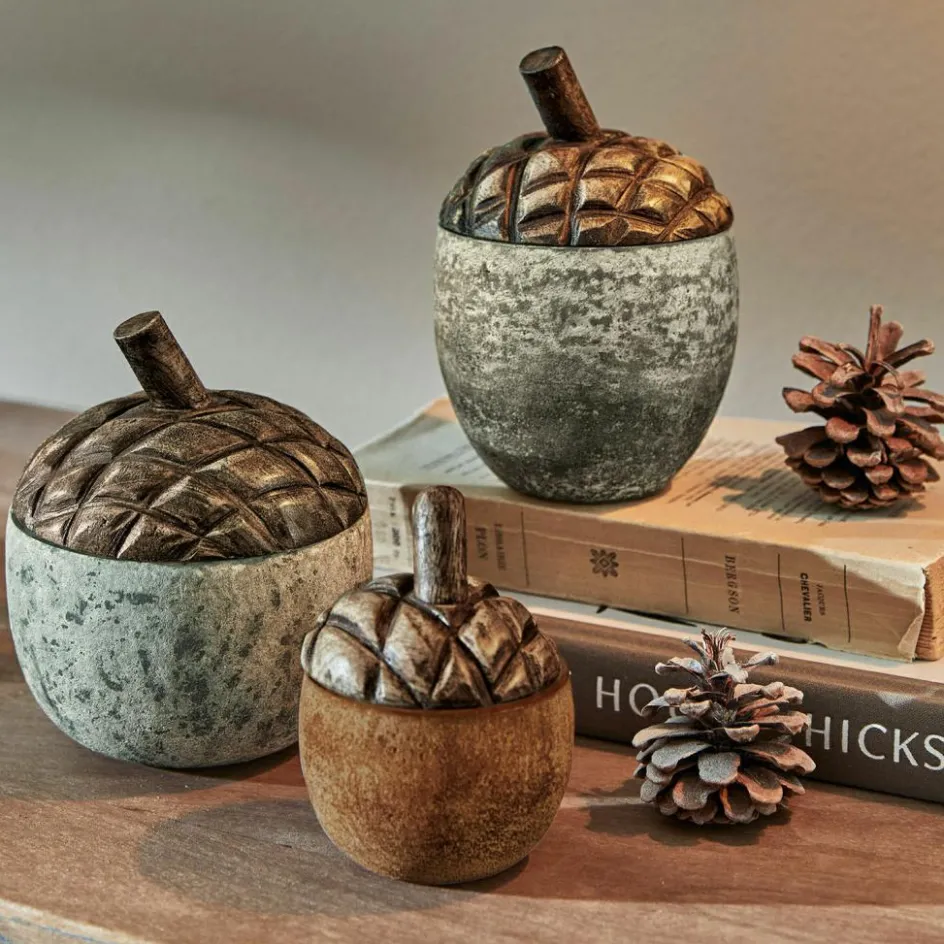 Diese Trio in drei Größen ist ganz bezaubernd und hat natürlichen Charme. Die Dosen haben einen Deckel in Form von Eicheln, der aus wertvollem Mangoholz besteht und von Hand geschnitzt ist. Das dicke Glas zeigt ein raues, interessantes Finish. Das Zusammenspiel von Glas und edlem Holz macht den speziellen Charakter dieser feinen Accessoires aus. Sie lassen sich bestens nutzen, um darin kleine Dinge zu verwahren, etwa Haarschmuck, Make-up oder Münzen. Im Bad könnten kleine Kosmetik-Utensilien hinein gelegt werden. Doch auch rein dekorativ machen sie sich sehr gut, vielleicht als naturnaher Schmuck auf dem Tisch oder im Regal platziert.