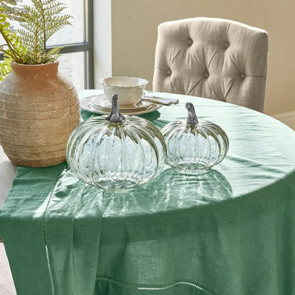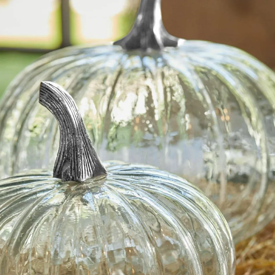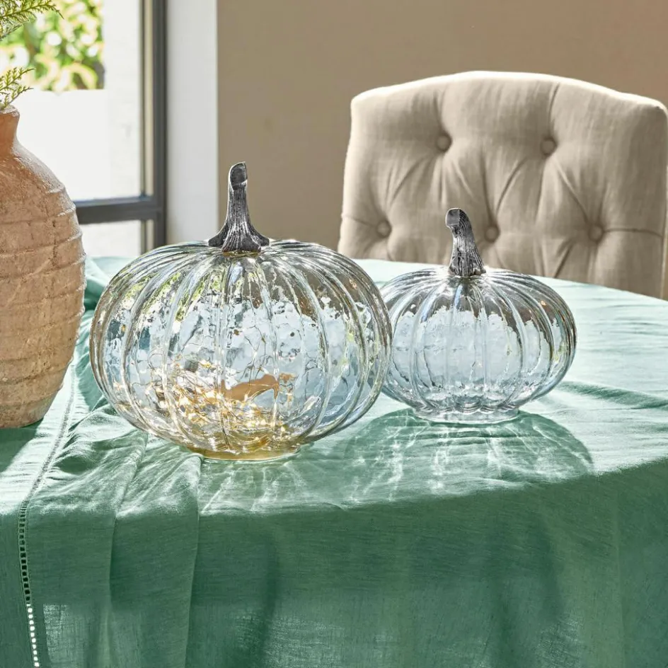 Wenn die Tage kürzer werden und das Licht weicher, ist es Zeit für Deko mit Charakter. Dieses zweiteilige Kürbis-Set aus Glas bringt genau das mit: seine irisierenden Orangetöne changieren je nach Blickwinkel und verleihen Ihrer Herbstdekoration ein warmes Leuchten. Die gewölbte Form mit markanten Rippen erinnert an üppige Kürbisse aus dem Garten, während der fein gearbeitete Aluguss-Stiel eine glänzende Note beisteuert. Besonders raffiniert: Beide Kürbisse sind an der Unterseite geöffnet – perfekt, um sie mit einer kleinen Lichterkette oder LED-Teelichtern von innen zu beleuchten. So entstehen leuchtende Akzente, die Fensterbank, Konsole oder Esstisch verzaubern.