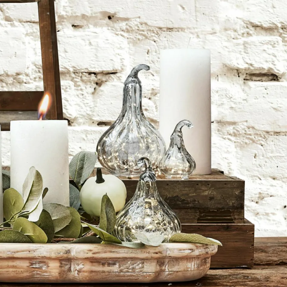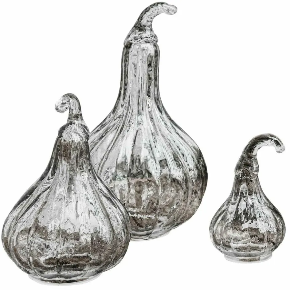 Ein wenig erinnern sie an den Kürbis aus dem Märchen, der sich in eine Kutsche verwandelt – diese drei verwunschenen Kürbisse aus Glas sind ganz bezaubernd. Hier wird das beliebte Herbstgemüse neu interpretiert. Die gläsernen Accessoires kommen in drei Größen zu Ihnen, und sie sind naturnah geformt. Durch die durchscheinende, klassische Optik harmonieren sie mit sehr vielen Wohnstilen und lassen sich vielseitig dekorieren, vielleicht mit Fundstücken aus dem Wald, Windlichtern oder auch ganz pur. Auf der Kommode oder als Tischschmuck platziert versprüht das nostalgische Trio seinen Charme. So wird der Herbst einfach wunderbar. Praktisch: Die Unterseite ist offen, sodass hier allerhand Deko eingefüllt werden kann. Setzen Sie zum Beispiel eine Lichterkette ein und lassen Sie die gläsernen Kürbisse auch im Dunkeln funkeln.