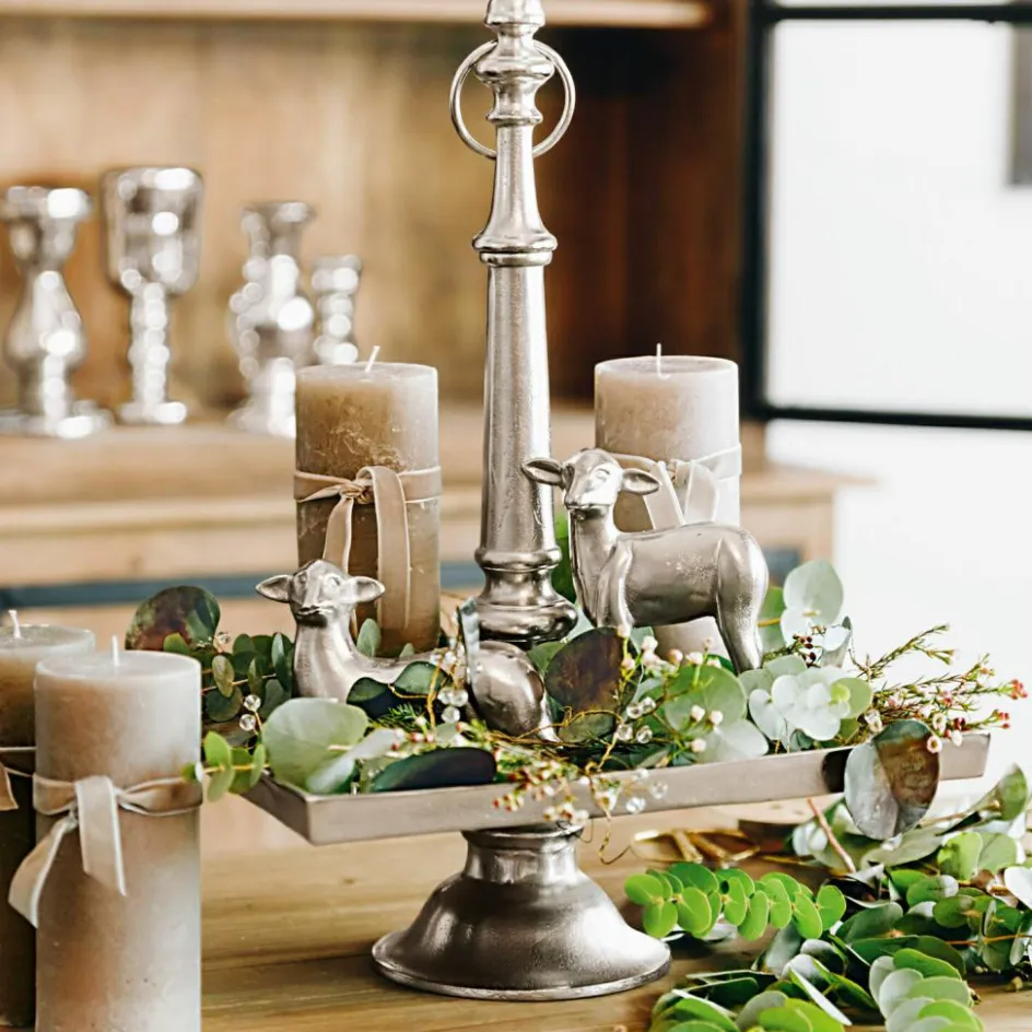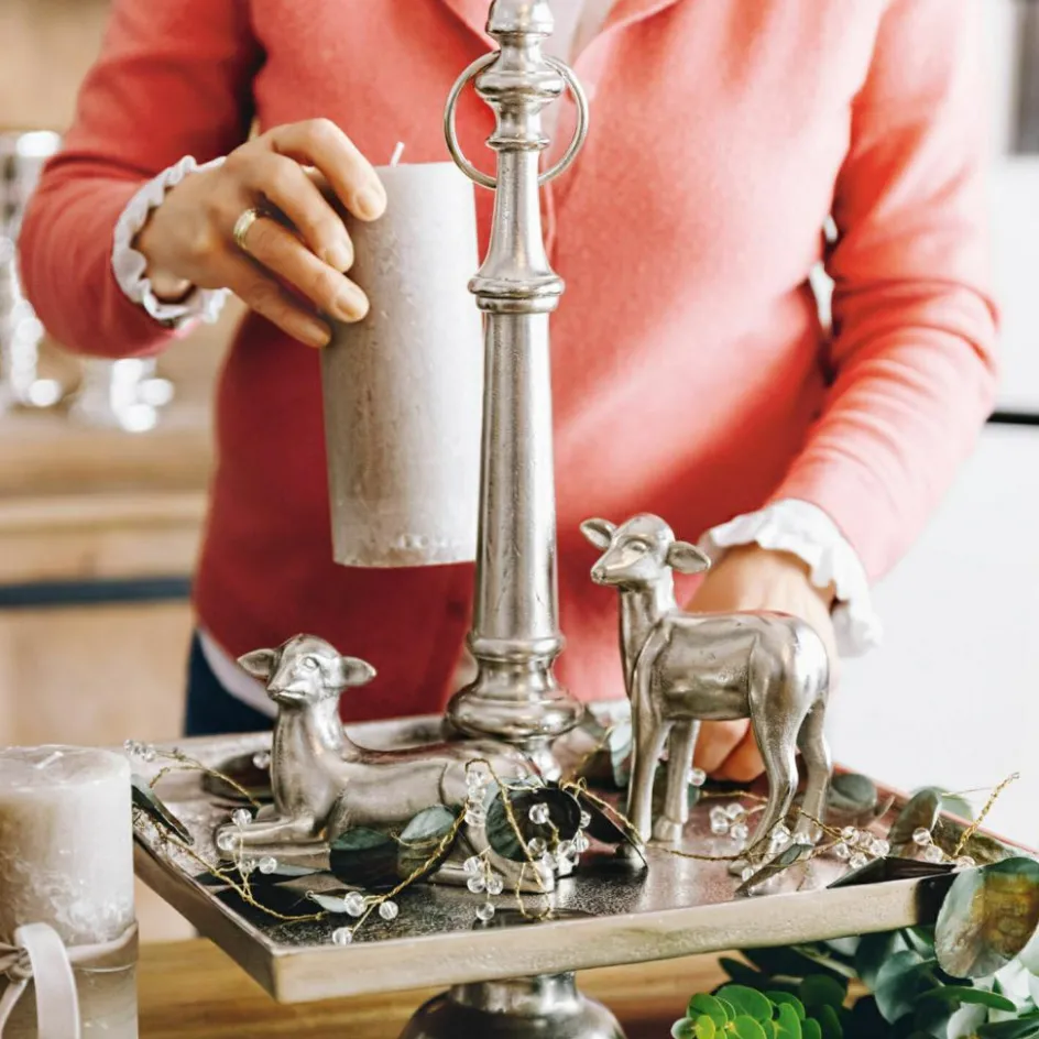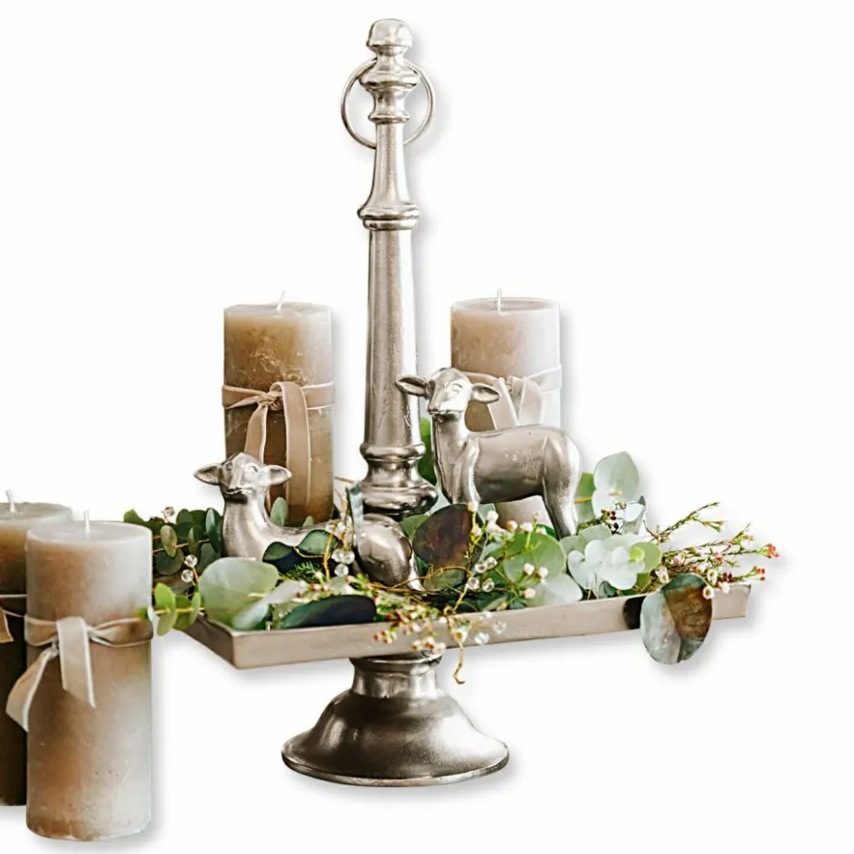 Sie wünschen sich einen luxuriösen und sehr ästhetischen Schmuck zu Ostern, der schon perfekt kombiniert zu Ihnen kommt? Dann ist dieses große und sehr harmonische Set die beste Wahl. Es besteht aus einer stilvollen Etagere, zwei niedlichen Osterlämmchen, einer sehr naturnahen Girlande sowie feinen Kerzen. All diese Schmuckstücke lassen sich wunderbar zusammen auf der Etagere arrangieren. Diese hat viel Vintage-Charme und besteht aus Aluguss mit Antik-Finish. Sie ist auch nach Ostern noch lange einsetzbar, etwa um Dekoratives oder kleine Leckereien darauf zu präsentieren. Beide Lämmchen aus Aluguss glänzen und sind in zwei Designs gefertigt. Die Kerzen sorgen für ein gemütliches Licht, sie sind von Hand gefertigt und ansprechend durchgefärbt. Und die Girlande ist sehr natürlich Magnolienblättern nachempfunden sowie in Handarbeit gefertigt und bemalt. Mit ihrem dünnen Eisendraht können Sie sie leicht formen und nach Wunsch drapieren. Nun ist es an Ihnen, all diese Lieblingsstücke auf der Etagere zu dekorieren – und schon können Sie sich auf einen individuellen und sehr charmanten Tischschmuck zum Osterfest freuen. Alle Teile des Sets können Sie natürlich auch einzeln oder mit anderem Schmuck arrangieren und so Ihr ganz persönliches Osterfest zelebrieren. Das Set besteht aus Etagere (12035), Kerze 4er Set (19679), Deko-Lamm 2er Set (20277) und Girlande (20129).