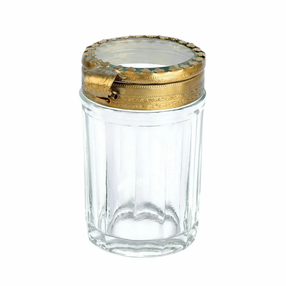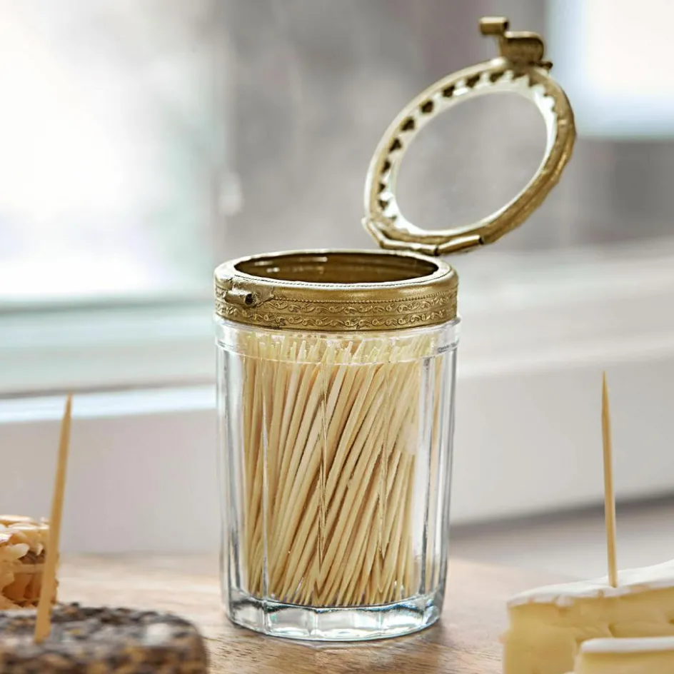 Wenn sogar die Zahnstocher stilvoll aufbewahrt werden, sind Sie wirklich ein Profi in Sachen Wohlfühlambiente. Diese hübsche Zahnstocherbox aus Glas und Messing ist hierfür die perfekte Wahl. Der fein gearbeitete Messing-Verschluss gibt ihr einen besonderen Charakter, und das ganze Design hat eine antike Note. Verleihen Sie Ihrer Tafel nostalgisches Flair und vereinen Sie hiermit Nutzen und Dekoration perfekt. Wer mag, könnte das hübsche Gefäß auch für andere sehr kleine Gegenstände nutzen, vielleicht um darin Ohrringe und ähnliches aufzubewahren. In jedem Fall kommt hiermit ein sehr charmanter Akzent zu einem Ambiente im Shabby-Chic zu Ihnen.