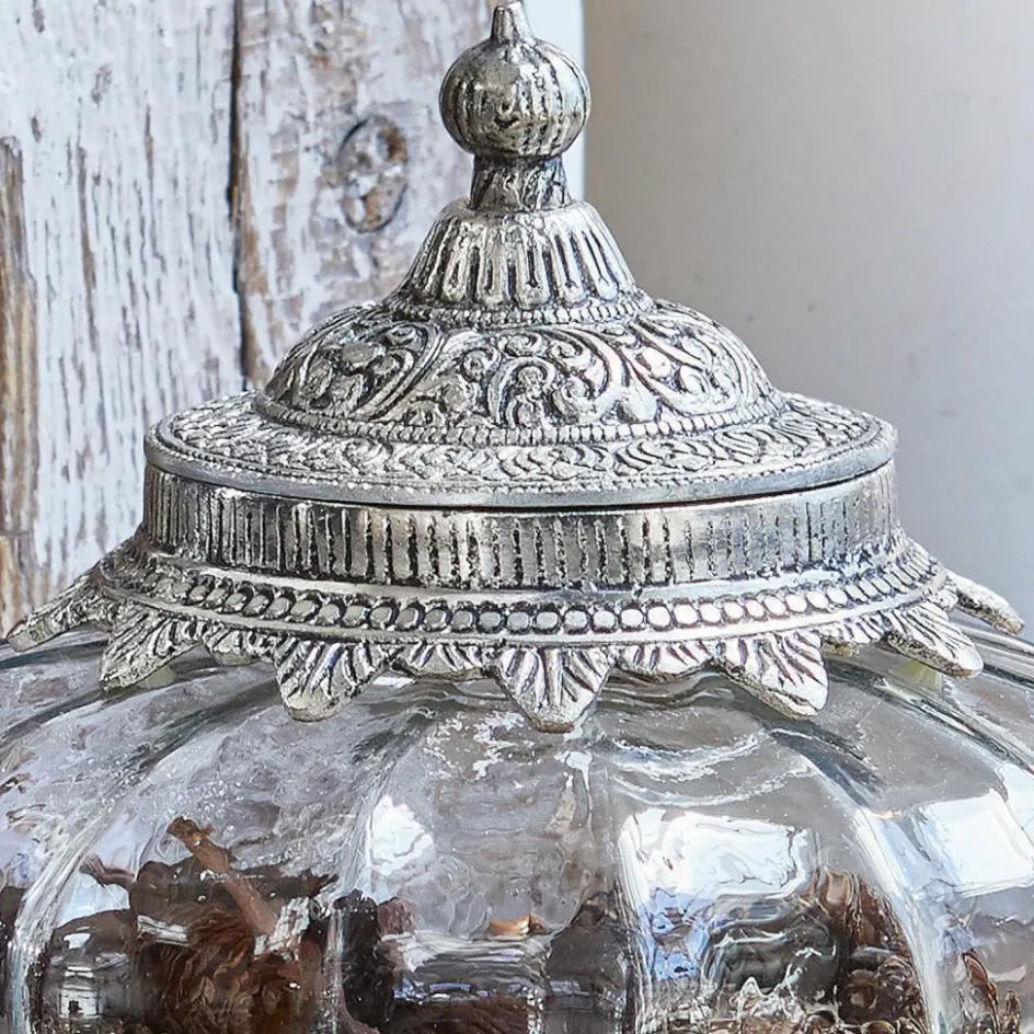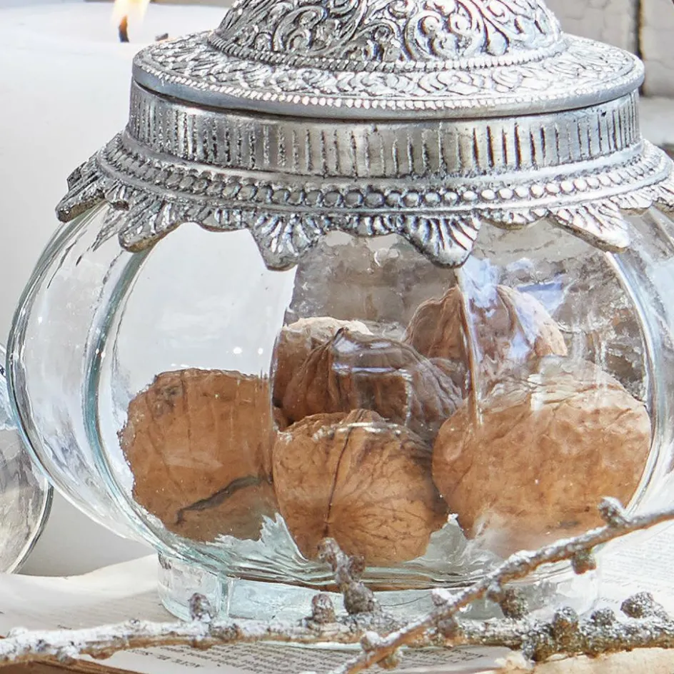 Ein Hauch von Orient schwingt bei diesem zauberhaften Gespann mit. Ein größeres und ein kleineres Döslein sind im Set enthalten. Die wunderschön gestalteten Deckel sind mit einem Antik-Finish veredelt und schließen wundervoll mit dem mundgeblasenen Glas ab. In den zauberhaften Hinguckern lässt sich Allerlei aufbewahren. Süßes, Nüsse oder vielleicht doch lieber hübsche Accessoires wie Ringe oder gar funkelnde Weihnachtsdekoration wie kleine Sternchen? Hier können Sie sich kreativ austoben. Doch auch ohne Inhalt sind diese zwei einfach ganz besondere Hingucker. Besonders schonend werden die Dosen mit einem trockenen Tuch gereinigt.