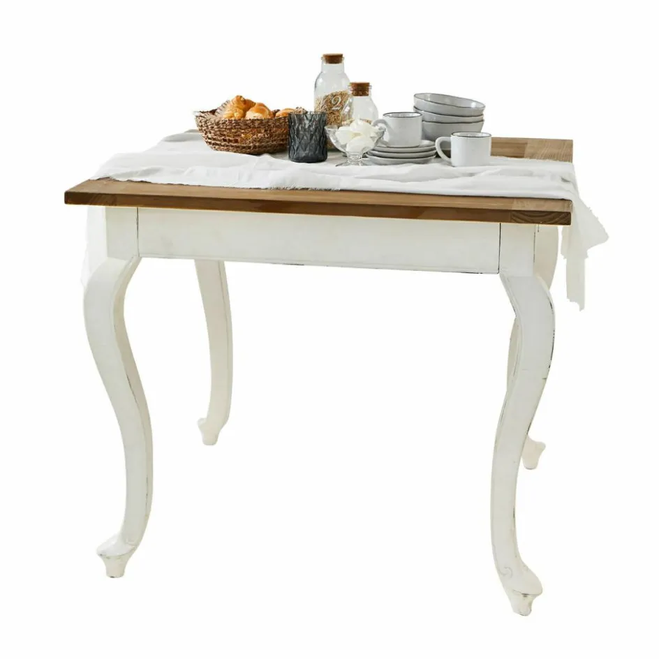 Dieser luxuriöse und sehr charmante Tisch ist wirklich ein Schmuckstück im nostalgischen Stil. Er hat reizende, anmutig geschwungene Beine und eine sehr ansprechende Zweifarbigkeit. Die Tischplatte besteht aus naturbelassenem Tannenholz, das Gestell ist aus lackiertem Pappelholz schwungvoll gestaltet und mit einem schönen Antik-Finish veredelt. Die flexibel ausziehbare Tischplatte bietet eine Größe von 90 bis 160 Zentimetern – ideal allein, zu zweit oder auch wenn Gäste kommen. In der Küche oder als Esstisch im Wohnzimmer leistet dieser edle Tisch allerbeste Dienste, und er ziert ein Ambiente im Shabby-Chic harmonisch. Sie könnten ihn auch als Arbeitstisch im Home Office oder als Lieblingsplatz zum Zeichnen und Schreiben nutzen – dieser elegante Tisch ist einfach immer perfekt und zudem wirklich eine Augenweide.