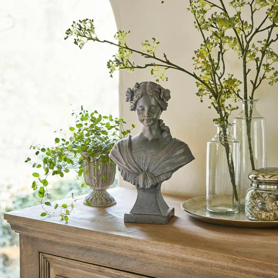 Diese wunderschöne Büste einer Dame holt das Flair der Antike zu Ihnen. Sie besteht aus Polyresin und hat eine edle Stein-Optik sowie eine angenehm glatte Haptik. Das wertvolle Schmuckstück erscheint wie ein Fund aus einer verwunschenen Villa. Sie ist sehr detailreich verziert, etwa mit zarten Blüten im Haar. Das Gesicht ist elegant und fein gestaltet. Die stilvolle Büste ist ein sehr geschmackvoller Schmuck für eine Kaminkonsole, im Regal oder auf einer Anrichte. Sie veredelt charmant jeden Raum, egal zu welchem Ambiente. Hieran werden Sie lange Zeit und in jeder Saison Freude haben. Träumen Sie sich bei ihrem Anblick in frühere Zeiten und geben Sie jedem Raum ganz leicht das besondere Etwas.