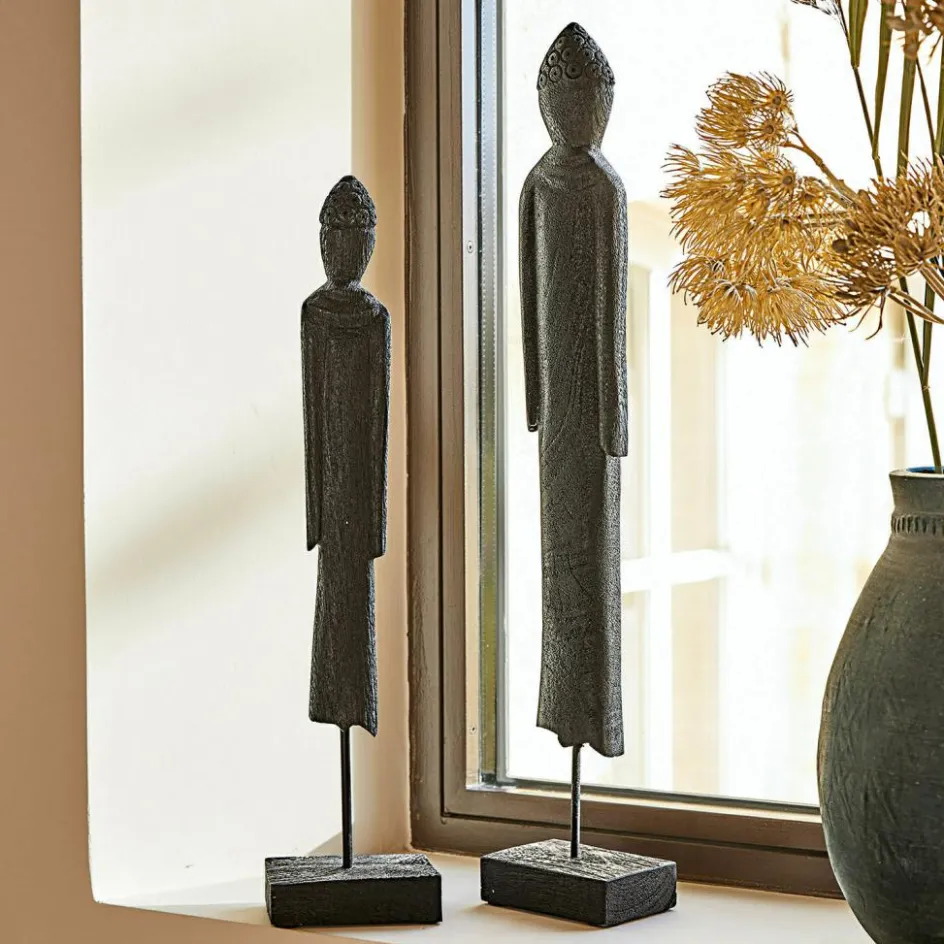 Diese zeitlosen Skulpturen aus feinstem Mangoholz erzählen stille Geschichten von Beziehung und Nähe, die die Seele berühren. Ihr sandgebürstetes Finish verleiht ihnen eine einzigartige Textur, die unter den Fingern spürbar ist und den Blick einfängt. Schlicht in ihrer Formensprache, aber tiefgründig in ihrer Wirkung, verleihen sie jedem Raum einen Hauch von Eleganz und Bedeutung. Die dunkle Farbgebung und schlanke Silhouette verleihen den Figuren eine mystische Präsenz, die dazu einlädt, über zwischenmenschliche Verbindungen und die Simplizität des Seins nachzudenken. Ein fesselndes Kunstwerk, das sowohl in modernen als auch in traditionellen Räumen besticht.