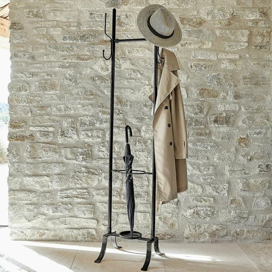 Diese Garderobe beeindruckt mit ihrer klassischen Anmutung und einem durchdachten Design. Das Eisen mit Antikbraun-Finish verleiht ihr eine charmante Patina, die von vergangener Zeit erzählt und dennoch zeitlos wirkt. Praktische Haken in verschiedenen Höhen bieten Platz für Jacken, Taschen und Hüte, während der integrierte Schirmständer nützliche Funktionalität hinzufügt. Die geschwungenen Details und der robuste Standfuß unterstreichen die hohe Handwerkskunst und machen die Garderobe zu einem funktionalen Schmuckstück für den Eingangsbereich. Ob alleinstehend oder in Kombination mit anderen Möbeln, sie verleiht jedem Raum einen Hauch von Nostalgie und Klasse.