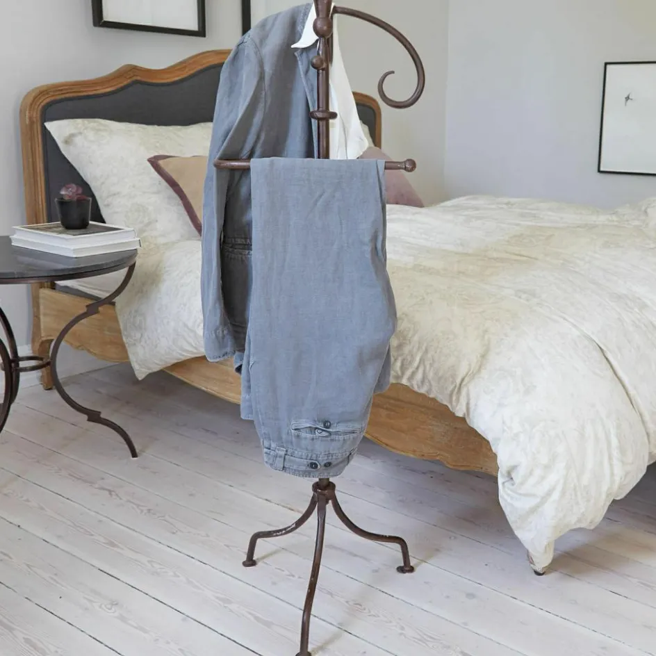 Wie ein Möbelstück aus vergangenen Zeiten steht dieser Ankleidehelfer da – charmant, charaktervoll und voller Persönlichkeit. Die elegant geschwungenen Linien aus massivem Eisen erzählen von Schmiedekunst und Stilgefühl, das nie aus der Mode kommt. Ob für das sorgfältig vorbereitete Outfit am nächsten Tag oder die elegante Abendgarderobe zwischendurch – dieses Stück hält nicht nur Kleidung bereit, sondern auch eine Prise Nostalgie. Das antikbraune Finish unterstreicht den Vintage-Charakter und macht ihn zum dekorativen Hingucker, der funktional überzeugt und dabei wohnliche Wärme ausstrahlt.