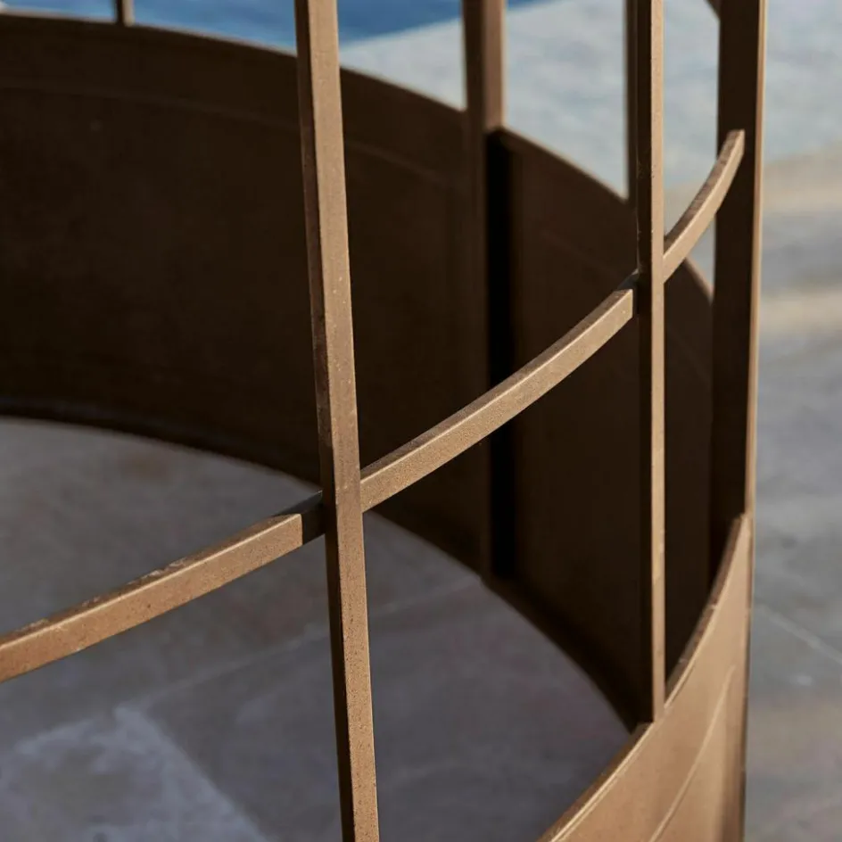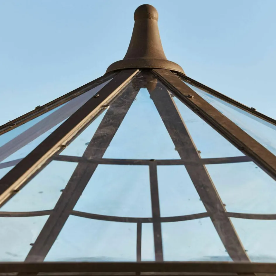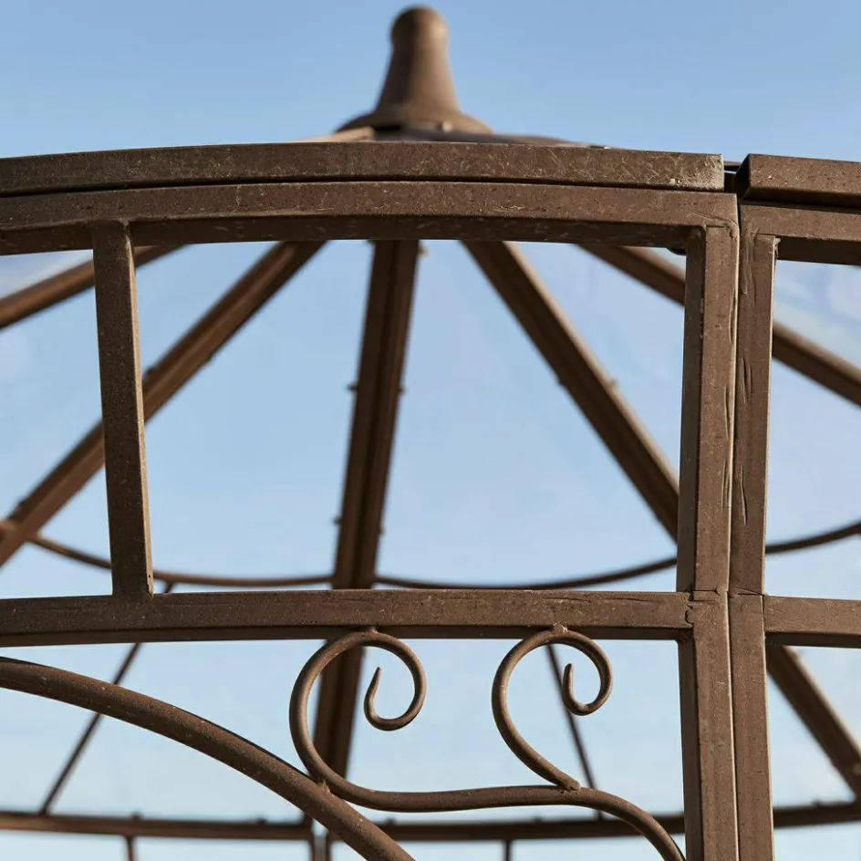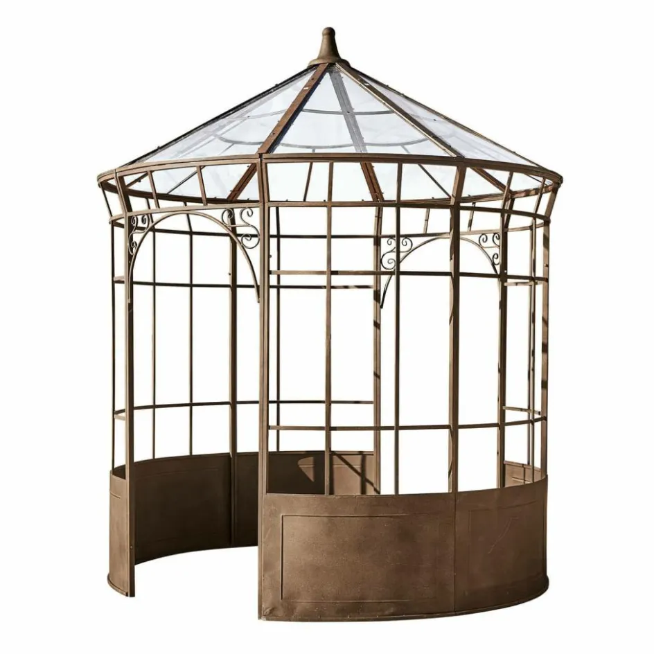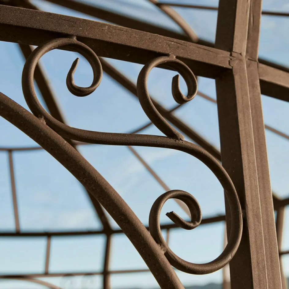 Ein lauschiger Rückzugsort zum Träumen oder Lesen, mitten im Grünen, aber dank verglastem Dach vor Regen und kühlen Winden geschützt – jede Stunde in diesem Pavillon verspricht ein besonderes Erlebnis, denn nirgendwo sonst können Sie Ihre Seele stilvoller baumeln lassen. Die klassische Konstruktion aus Eisen erinnert an die antiken Lauben, die man noch heute in den idyllischen Nischen französischer Schlossparks entdecken kann. Auch bei diesem Pavillon sorgt das traditionelle Material für die außerordentliche Stabilität und Witterungsbeständigkeit, die sorgfältigen Verarbeitungsdetails und die kunstvollen Verzierungen aber erzählen, dass hier ein Handwerker mit Liebe zu seiner Profession am Werk war. Die Krönung ist die authentische Edelrost-Patina, die dem Pavillon die ehrwürdige Aura seiner antiken Vorbilder verleiht. Stellen Sie Tisch und Stühle hinein und genießen Sie so oft es geht die besondere Atmosphäre der Ruhe und Geborgenheit. Und auch wenn mal ein paar Regentropfen fallen, wird das Ihr Wohlbehagen nicht stören, denn das Dach ist mit einer hochwertigen Plexi-Verglasung ausgestattet.