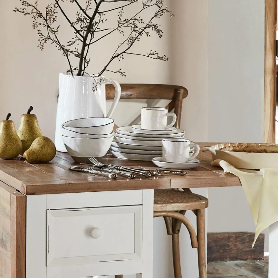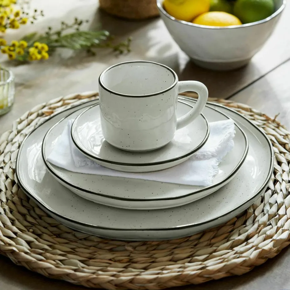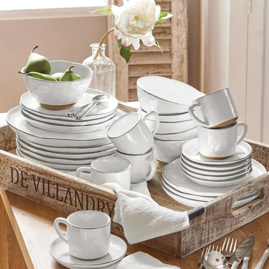 Ein reizendes, großes Set aus dreißig Teilen mit ganz ursprünglichem Charme. Das schicke Geschirr ist bewusst uneben designt, was ihm eine handgemachte Anmutung gibt. Es besteht aus Steinzeug mit handgetöpferter Optik. Der Boden ist bei allen Elementen unglasiert. Besonders bei den Schüsseln ist das sehr gut zu sehen. Diese unbearbeitete Seite macht das ganze Set noch reizvoller. Diese natürliche, mediterrane Note sorgt für Urlaubsgefühle. Hiermit ist Ihre Tafel immer perfekt passend und harmonisch eingedeckt. Das große Set ist ideal für Mahlzeiten mit Freunden und Familie in geselliger Runde. Enthalten sind sechs Abendessenteller, sechs Beilagenteller, sechs Tassen, sechs Unterteller und sechs Schüsseln. Vom Kaffee am Morgen bis zu Brunch und Frühstück, einem leichten Salat am Mittag, Obst und Käse als Snack, Kaffee und Kuchen am Nachmittag bis hin zum Dinner am Abend sind Sie hiermit bestens ausgestattet. Kleinere Sets dieses hochwertigen Geschirrs, wie zum Beispiel ein Set aus sechs Tellern oder ein Set aus sechs Tassen samt Untertassen, können Sie ebenfalls separat hier im Shop bestellen. Suchen Sie einfach nach unserer Biarré-Geschirrreihe. Wir wünschen guten Appetit.