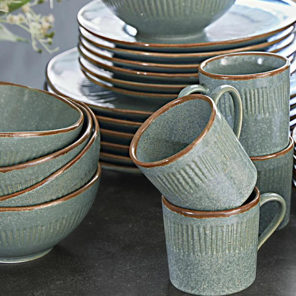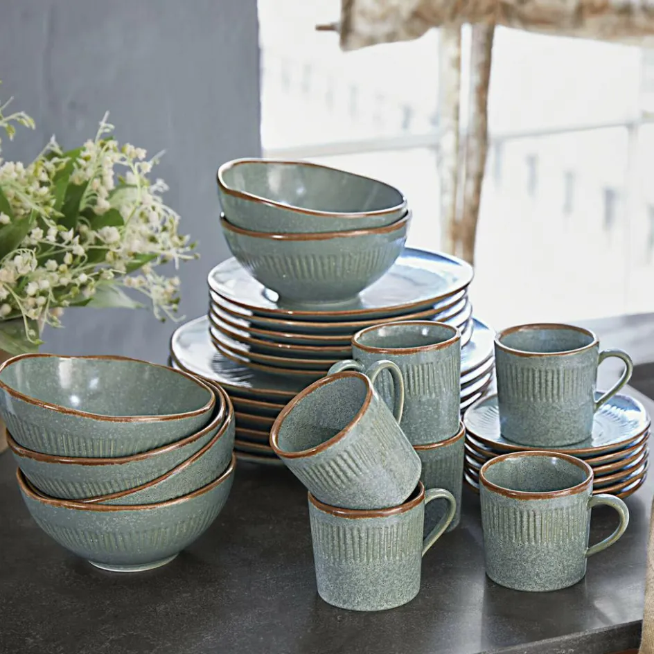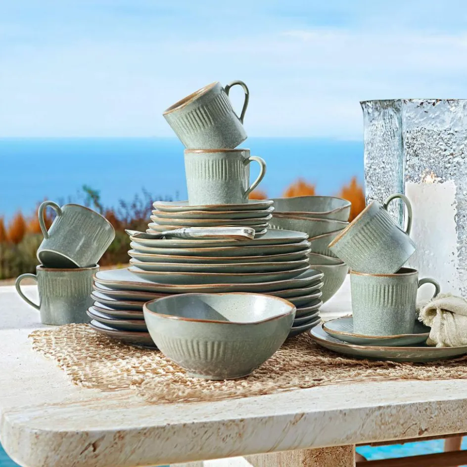 Das Auge isst mit! Dieses alte Sprichwort erinnert daran, dass es nicht nur auf das ankommt, was auf dem Teller serviert wird, sondern auch, wie es präsentiert wird. Mit diesem 30-teiligen Geschirr Set wird Ihre Tafel schon ohne Ihre kulinarischen Genüsse ein Augenschmaus. Die exklusive Kreation wurde aus hochwertigem Steinzeug gefertigt, einem Material, das im 18. Jahrhundert in England erfunden wurde und von dort seinen Siegeszug in die Landhäuser Europas antrat – vom urigen, englischen Cottage bis in die sonnenverwöhnte, mediterrane Region. Mit dem bewusst unebenen Design erinnert das Geschirr Set an handgetöpferte Originale, während das aufwendige, dreidimensionale Rillenmuster und der nicht lasierte Boden den individuellen Charakter unterstreicht. In dezentem Taupe passt es zu allen Interieurs und lässt die verschiedensten Speisen besonders appetitlich wirken. Doch Steinzeug ist nicht nur ein bewährtes, robustes Material, die modernen Varianten wie bei diesem Geschirr Set sind sogar spülmaschinenfest und mikrowellengeeignet.