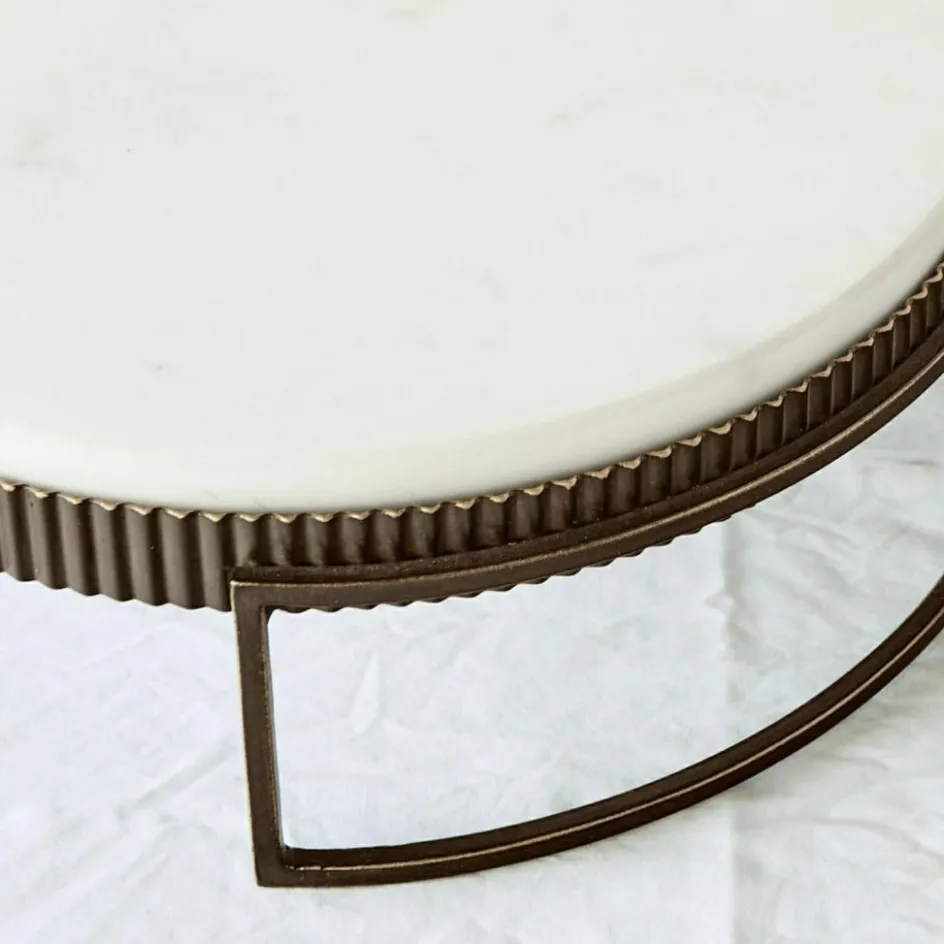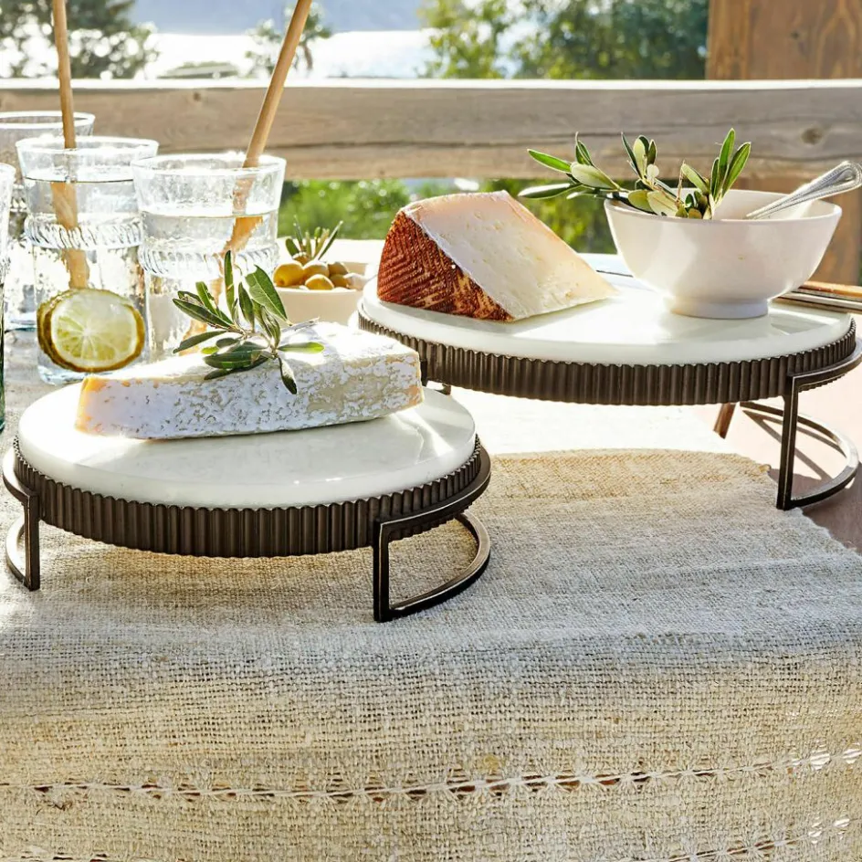 Das Plattenset vereint edlen Marmor und kunstvoll bearbeitetes Metall in einem Design, das Charakter und Raffinesse ausstrahlt. Die runde Form der Platten, umgeben von einem filigranen, geriffelten Metallrand mit dezentem Antikgold-Finish, lässt jedes Stück wie ein kleines Kunstwerk wirken. Die natürliche Marmorstruktur erzählt ihre eigene Geschichte und zieht mit ihren feinen Nuancen und Farbvariationen alle Blicke auf sich. Das Eisen-Gestell, in sanft geschwungenem Design, gibt den Platten eine leicht schwebende Wirkung und fügt sich harmonisch in verschiedene Raumkonzepte ein. Ein Ensemble, das durch seine ausgewogene Form und seine außergewöhnliche Materialkombination besticht und jedem Interieur das gewisse Etwas verleiht.