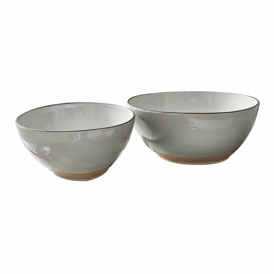 Dieses charmante Duo bringt einen Hauch Mittelmeer auf Ihre Tafel. Die schönen Schalen aus Steinzeug haben eine reizvolle Optik, welche an Handwerkskunst aus dem sonnigen Süden erinnert. Leichte Unebenheiten sind hier ganz bewusst gestaltet, um dem Set noch mehr individuelles Flair zu verleihen. Der edle, dunkle Rand ist ein hübsches Detail, so wie auch der unglasierte Boden. Sie erhalten zwei Größen im Set. Die beiden stilvollen Schalen lassen sich sehr vielseitig nutzen, etwa um Pasta oder Salat zu genießen. Oder arrangieren Sie Oliven und Nüsschen darin, servieren Sie eine Suppe oder naschen Sie frisch geschnittenes Obst daraus. Wer möchte, könnte auch dekorative Arrangements erschaffen, vielleicht mit Trockenblüten und Muscheln befüllt. Und auch zum Aufbewahren kleiner Dinge wie Haarnadeln bieten die attraktiven Schalen sich an. Freuen Sie sich auf zwei echte Multitalente.