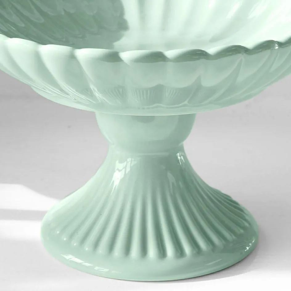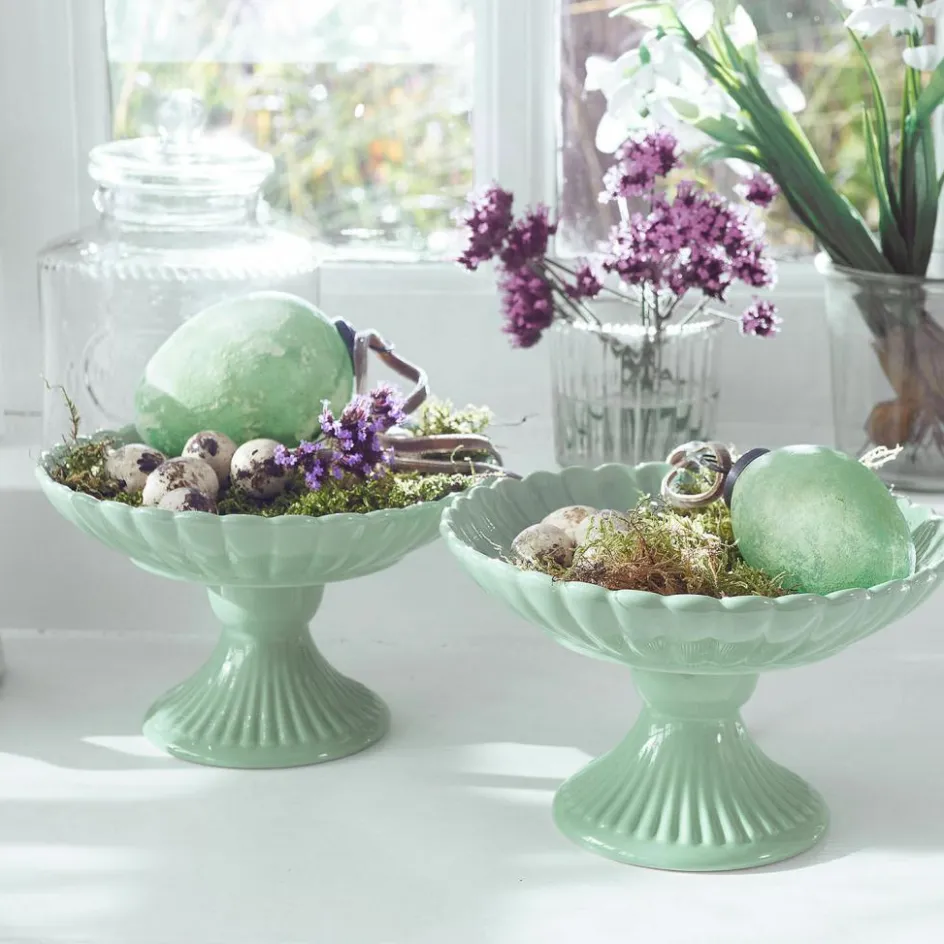 Die beiden Schalen aus edlem Porzellan kombinieren klassische Formen mit einem sanften, mintgrünen Farbton, der Frische und Leichtigkeit ausstrahlt. Jede Schale steht auf einem elegant geriffelten Fuß und besitzt eine filigran geschwungene Schalenform, die an Blütenblätter erinnert. Die handbemalte Oberfläche verleiht ihnen eine zarte, hochwertige Anmutung und macht sie zu einem besonderen Blickfang auf jeder Tafel. Ob als Präsentationsschale für Gebäck oder einfach als stilvolles Dekorationselement – diese Schalen verleihen Ihrem Zuhause eine geschmackvolle Note und setzen Akzente, die begeistern.