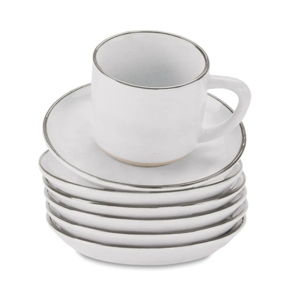 Sechs Schmuckstücke, die aussehen wie von Hand gemacht. Der besondere, gewollt unebene Charakter der edlen Tassen aus Steinzeug gibt ihnen individuellen Charme. Sie sind glänzend glasiert, außer am Boden, und haben einen dunklen Rand oben. Der mediterrane Charakter entführt Sie bei Tisch unter südliche Sonne und lässt uns von Spanien oder Italien träumen. Die Untertassen sind auch schon im Set enthalten. Genießen sie hieraus den ersten Kaffee am Morgen, einen Eistee oder auch Obst, Müsli, Eiscreme oder Joghurt. Für die große Runde mit Freunden oder der ganzen Familie erhalten Sie ein geschmackvolles, dezentes Set, das jede Tafel adelt. Drinnen wie draußen erleben Sie hiermit zu jeder Jahreszeit echte Gemütlichkeit und ein Gefühl der Entschleunigung, wenn Sie sich bewusst einfach nur einem Getränk oder einer kleinen Speise widmen.
