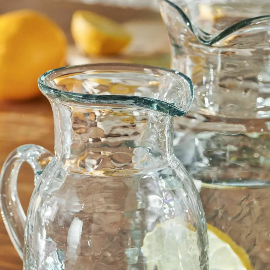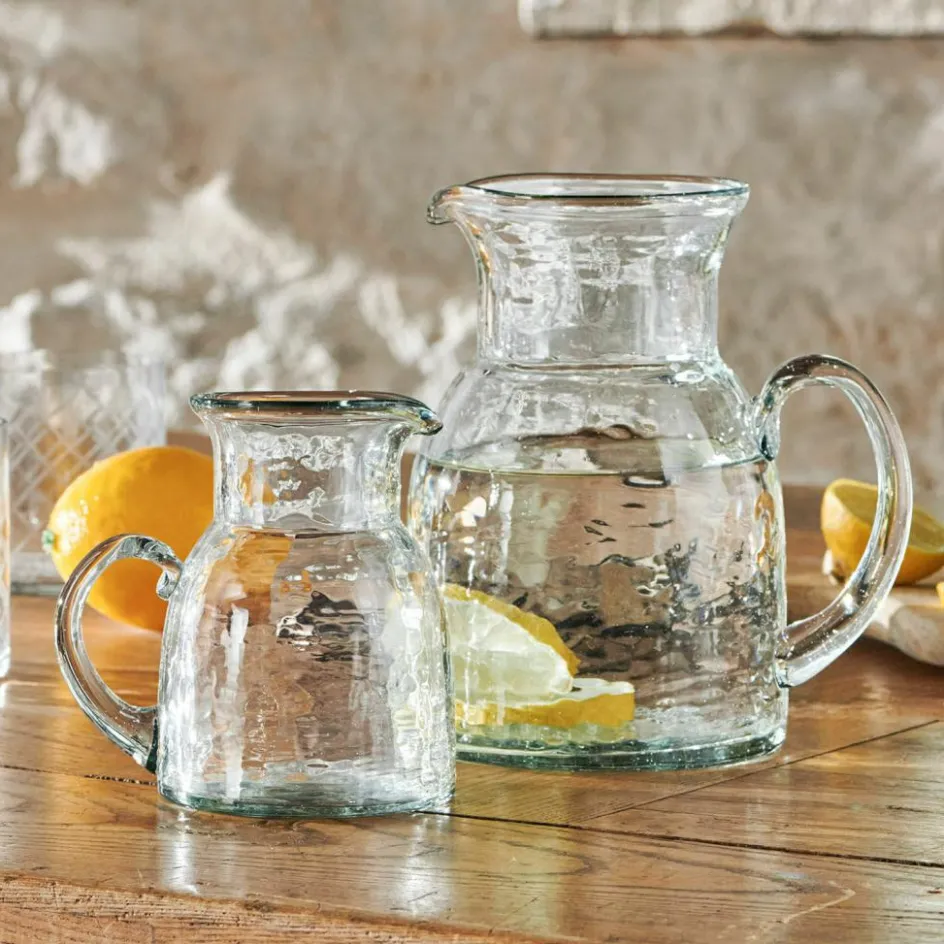 Dieses 2er-Set aus mundgeblasenem Glas verkörpert zeitlose Schlichtheit und Charme. Der größere Krug mit 1,2 Litern bietet ausreichend Platz für erfrischende Getränke, während der kleinere mit 0,35 Litern ideal für Dressings, Saucen oder Milch ist. Die zarte, leicht strukturierte Oberfläche verleiht jedem Stück eine individuelle Note, die durch die besondere Verarbeitung entsteht. Das klare Design harmoniert mühelos mit jedem Einrichtungsstil und sorgt für eine angenehme Leichtigkeit auf Ihrem gedeckten Tisch. Ideal für Liebhaber natürlicher Materialien und schlichter Formen.