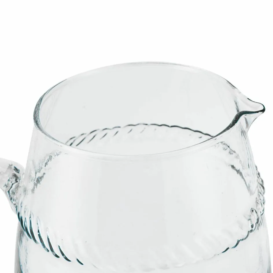 Dieser Krug ist ein echtes Schmuckstück auf jeder Tafel – im Haus wie im Garten, im normalen Familienalltag wie bei größeren Feiern. Das mundgeblasene Glas wurde mit einer dezenten Struktur und einem charmanten Reliefdekor verziert, das den Unikat-Charakter dieses edlen Accessoires unterstreicht. Ob Wasser oder Saft, Eistee oder Limonade – noch nie haben Sie kühle Getränke so stilvoll serviert wie mit diesem Krug! Und Ihre Familie und Gäste dürfen gerne großen Durst haben, denn der Krug hat ein stattliches Fassungsvermögen von 2,5 l, sodass Sie ihn auch nicht gleich wieder füllen müssen, wenn alle versorgt sind. Und wenn niemand Bedarf an kühlen Getränken hat, macht sich auch ein bunter Sommerblumenstrauß ganz ausgezeichnet darin. Im gleichen Design gibt’s ein passendes Glas 6er Set (23094). Krug und Gläser sind natürlich spülmaschinenfest.