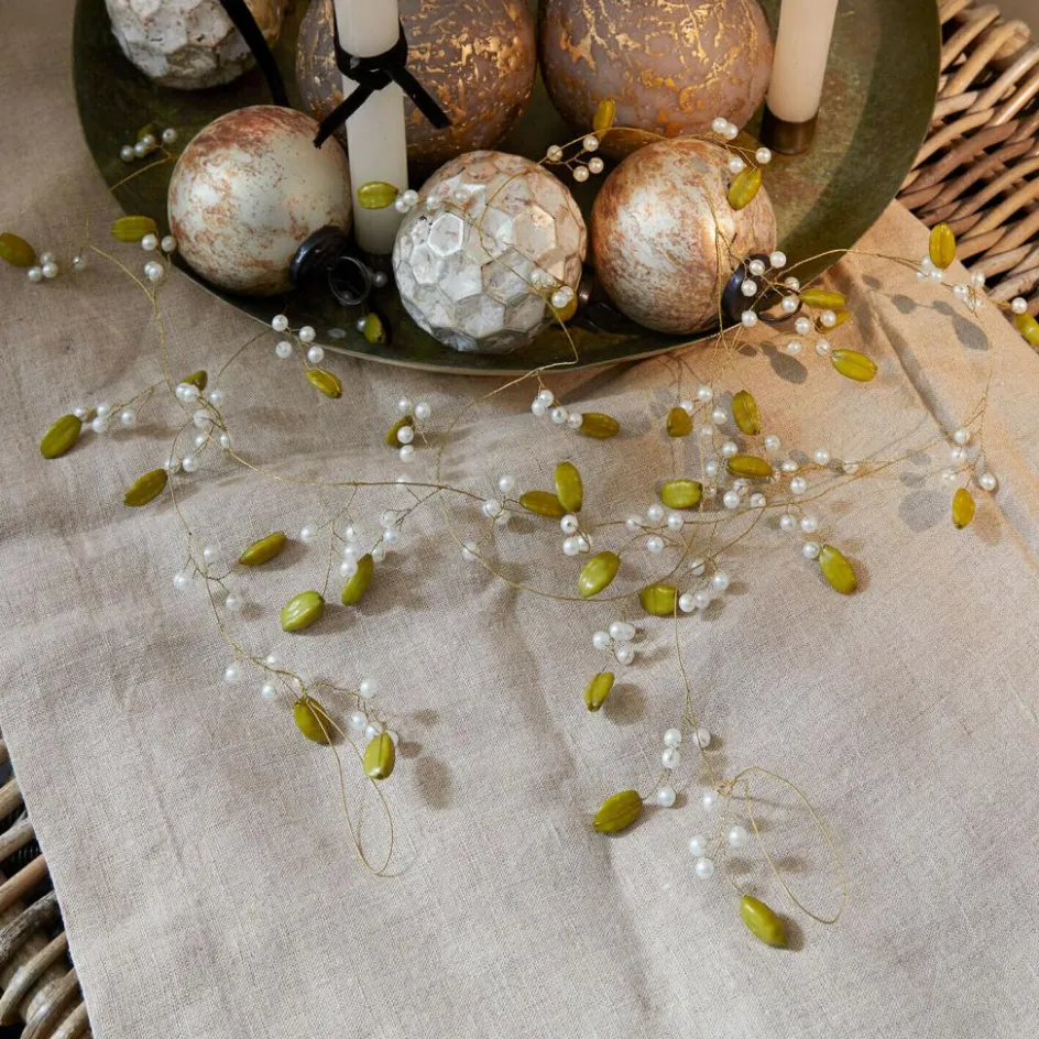 Wie ein glitzernder Hauch rankt sich diese Girlande um Vasen, Kerzenständer oder Geschenke – mit einer besonderen Raffinesse: Statt klassischer Blätter funkeln hier länglich geformte Perlen neben zarten Rundperlen in sanftem Schimmer. Beide Formen wirken wie kleine Tautropfen, eingefangen auf einem feinen goldenen Draht, der sich spielerisch biegen lässt. Die edle Kombination aus Perlenoptik und organischem Design verleiht dieser Girlande etwas Poetisches – ein leiser, dekorativer Akzent, der jeden Raum sanft schmückt.