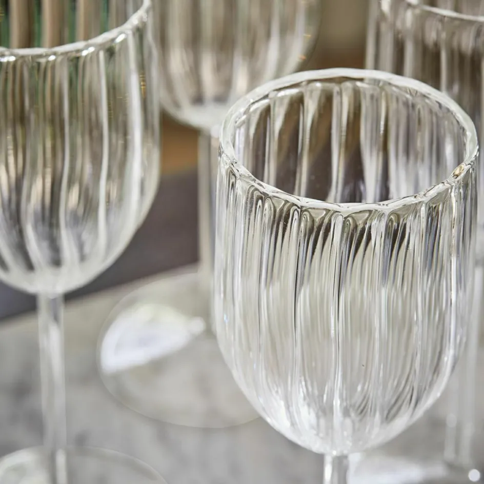 Wenn sich Handwerk und Stil vereinen, entsteht Glas wie dieses: Jedes der sechs mundgeblasenen Gläser ist ein kleines Kunstwerk, geprägt von feinen Rillen, die sich wie gefalteter Stoff über den Korpus ziehen. Diese Struktur ist nicht nur ein optisches Highlight – sie liegt auch angenehm in der Hand und bricht das Licht auf besonders reizvolle Weise. Der schlanke Stiel, die ausgewogene Proportion und die subtile Brillanz machen dieses Set zum idealen Begleiter für edlen Wein, festliche Anlässe oder einfach einen besonderen Moment zwischendurch. Ob auf einer rustikalen Holztafel oder einem gedeckten Festtagstisch – diese Gläser bringen Leichtigkeit und Stil auf jede Bühne.