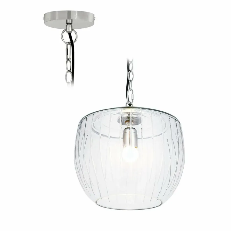 Man könnte meinen, ein Tropfen Licht sei in Glas gefangen worden – so zart und doch ausdrucksstark wirkt diese Hängelampe. Die mundgeblasene Glaskugel entfaltet mit ihren geschliffenen Rillen ein faszinierendes Spiel aus Reflexion und Transparenz. Jeder Blickwinkel offenbart neue Lichtlinien, die sich an der Oberfläche entlangziehen wie feine Strahlen. Das klare Glas wirkt dabei angenehm zurückhaltend, während das metallische Element am oberen Abschluss sowie die markante Gliederkette einen modernen Twist setzen. Ob über dem Esstisch, im Flur oder als einzelnes Statement in einer Leseecke – diese Leuchte bringt nicht nur Licht, sondern auch eine Prise Magie in den Raum.