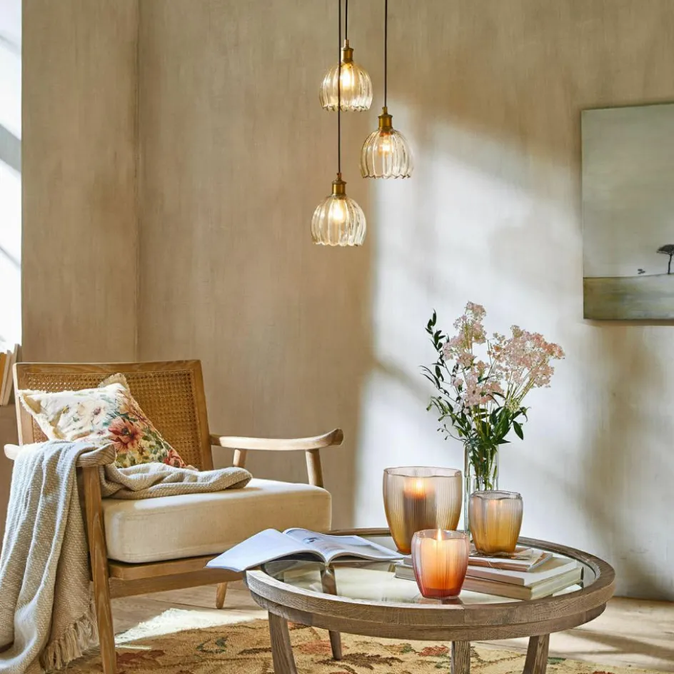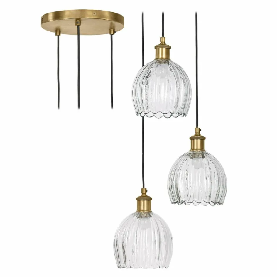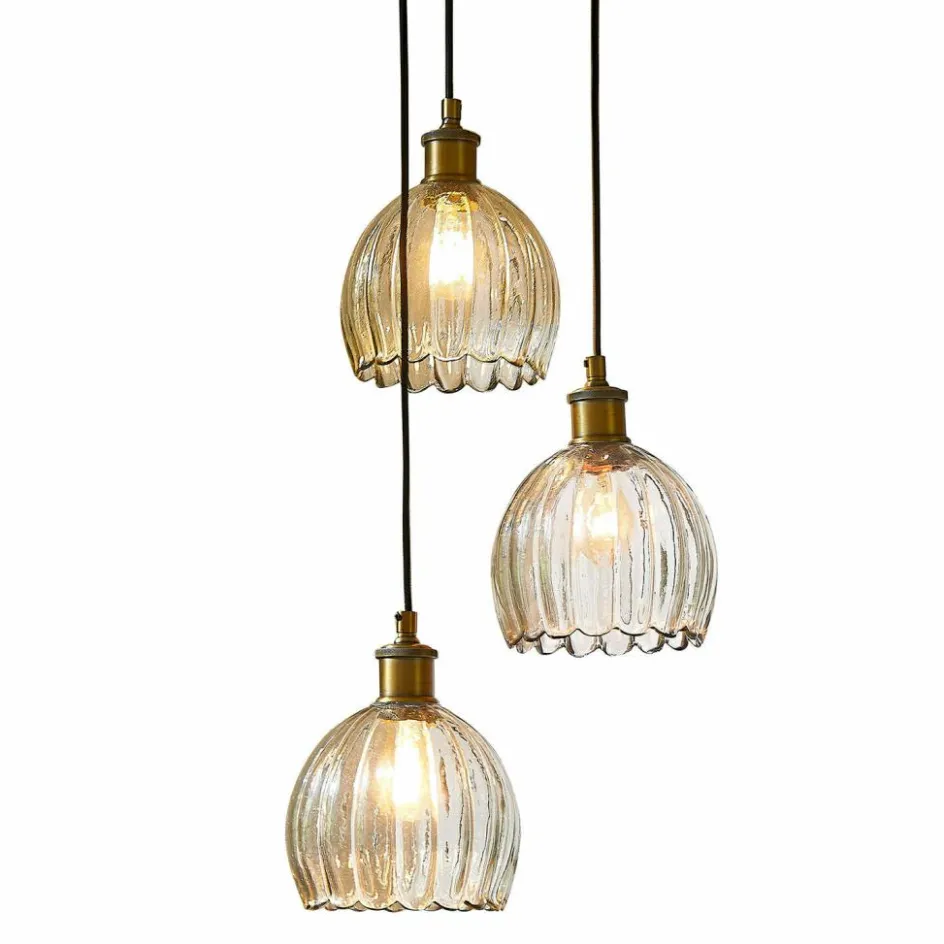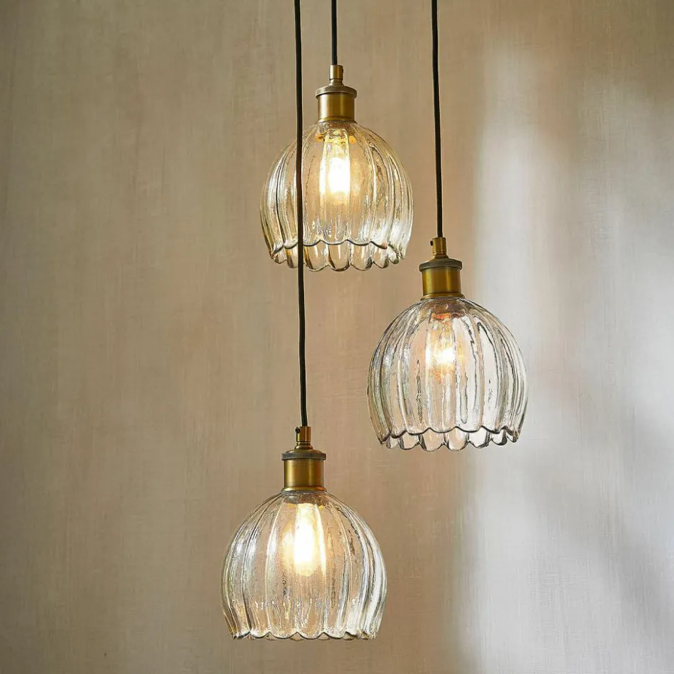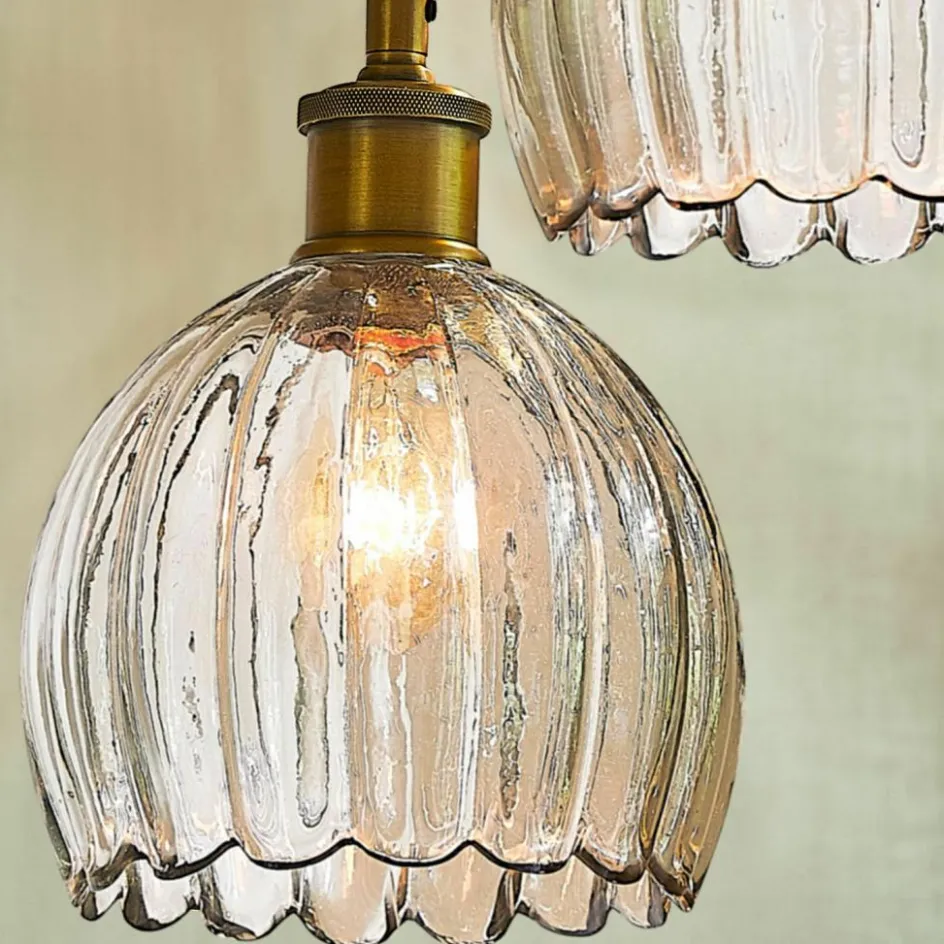 Tauchen Sie ein in die stimmungsvolle Welt dieser Hängelampe, die mit ihrer einzigartigen Gestaltung und hochwertigen Materialien begeistert. Die sanften Wellen der dicken, geriffelten Glasschirme in Blumenform brechen das Licht auf besondere Weise und schaffen ein harmonisches Spiel von Schatten und Glanz. Jeder Lampenschirm wirkt wie eine zarte Blüte, die den Raum mit einem sanften Lichtkegel erfüllt. Der robuste Baldachin und die Fassung aus Eisen setzen einen anmutigen Kontrast zum zarten Glas und verleihen der Lampe ein robustes, aber dennoch raffiniertes Erscheinungsbild. Ob über dem Esstisch, in der Küche oder als Highlight im Wohnzimmer – diese Hängelampe zieht alle Blicke auf sich und schafft eine warme, einladende Atmosphäre.