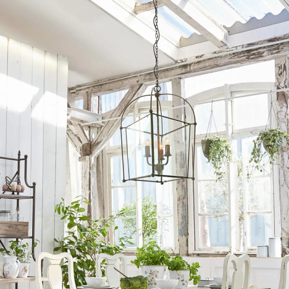 Ein echtes Statement, das mit kontrastierenden Formen spielt und dadurch absolut einzigartig wirkt. Das filigrane Eisengestell umschließt einen verglasten Kasten, der drei kunstvoll geformte Fassungen beherbergt. Ein antik-inspiriertes Shabby-Finish unterstreicht das stilvolle Design. Es steckt viel Liebe zum Detail in diesem eleganten Lichtspender und seiner aufwendig veredelten Oberfläche. Die transparente Verglasung erlaubt es, mit unterschiedlichen Leuchtmitteln zu experimentieren, um die gewünschte Lichtstimmung zu erzeugen. Doch egal für welche Leuchtmittel Sie sich entscheiden, diese Hängelampe ist durch Form und Farbgebung einzigartig schön. Begrüßen Sie Ihre Gäste damit im Flur, wie in langen Hallen eines Schlosses. Oder hängen Sie sie in Ihre Wohnräume und verleihen Sie Ihrem Zuhause eine ganz besondere Atmosphäre.