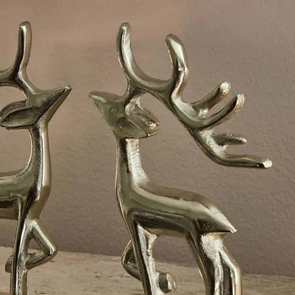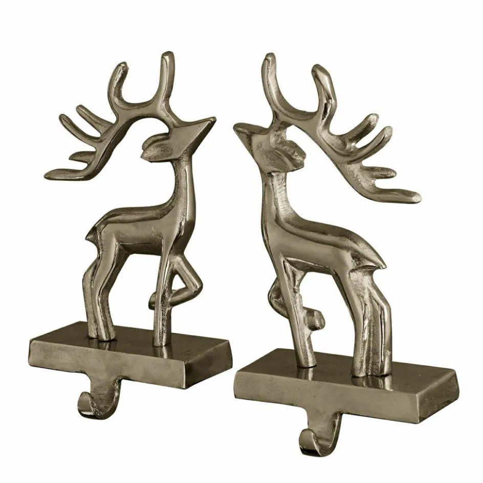 Diese beiden Waldbewohner mit den imposanten Geweihen sind nicht nur in der Winterzeit hübsche Hingucker, die sich nebenbei als praktisches Haken 2er Set nützlich machen. Im Flur, um Jacken, Mäntel und Taschen ordentlich zu verstauen, aber auch im Schlaf- oder Ankleidezimmer, in der Küche oder im Wohnraum können Sie die verschiedensten praktischen oder dekorativen Dinge wie Kränze, Lichterkette oder was immer Sie möchten an die Haken hängen. Die stilisierten Silhouetten und der trendige Aluminiumguss mit der typischen Oberflächenstruktur machen das Haken 2er Set zu einem zeitlos schönen Accessoire, das perfekt ein traditionelles Landhaus-Ambiente abrundet, aber auch in ein modernes Interieur passt. Tipp: Hängen Sie die beiden Haken so, dass sich die Hirsche anschauen oder lassen Sie gleich vier Hirsche als Gruppe in die Ferne ziehen.