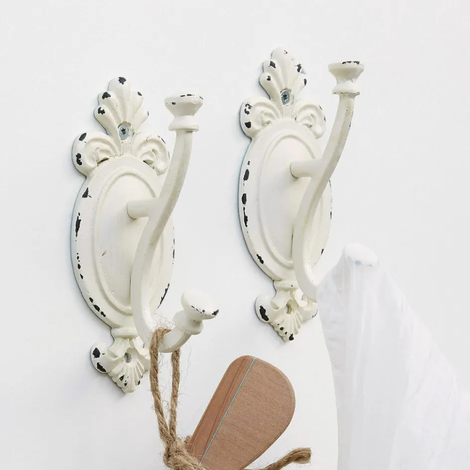 Dieses nostalgische Haken-Duo im historischen Design verzaubert Ihr Zuhause: Es macht sich hervorragend in Flur, Bad oder Küche. Dort freuen sie sich auf Kleidungsstücke, Tücher oder Gegenstände aller Art. Die stabilen Eisenhaken sind mit einem faszinierenden Finish versehen, das die Antik-Optik unterstreicht. Die praktischen Helfer mit dem außergewöhnlichen Look passen dank ihres Designs perfekt zum Shabby Chic und französischen Landhaus-Stil.