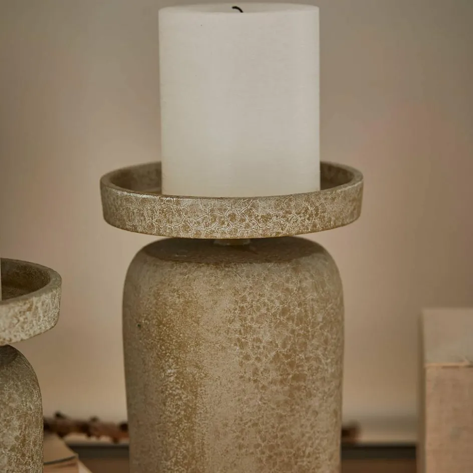 Dieses 3er-Set von Kerzenhaltern verbindet schlichte Formen mit einer erdigen Ausstrahlung. In verschiedenen Höhen gestaltet, lassen sie sich wunderbar gruppieren und wirken sowohl einzeln als auch zusammen sehr harmonisch. Die warmen, matten Naturtöne erinnern an verwitterten Sandstein und verleihen jeder Umgebung eine ruhige, zurückhaltende Note. Das Material besteht aus gegossenem Metall, das durch seine strukturierte Oberfläche eine fast steinartige Haptik erhält – stabil, langlebig und dennoch wohnlich. Ob im Wohnzimmer, auf dem Esstisch oder als stimmungsvolle Lichtquelle auf dem Balkon – mit diesen Haltern setzen Sie bewusst ruhige Akzente.