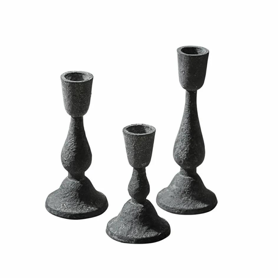 Mit diesem dreiteiligen Kerzenhalter-Set zieht ein Hauch von rauer Poesie in Ihr Zuhause ein. Gefertigt aus Eisen und veredelt mit einer antikgrauen Oberfläche, bringen die Kerzenhalter eine besondere Tiefe ins Spiel – durch ihre leicht unregelmäßige Textur, die an verwittertes Gestein erinnert, und die individuell gestalteten Formen, die sich perfekt ergänzen. Ob als Ensemble auf dem Esstisch, einzeln auf Sideboards oder kombiniert mit Naturmaterialien auf einer festlichen Tafel – diese Kerzenhalter schaffen eine warme Lichtstimmung mit kraftvoller Ausdruckskraft. Ein Set, das durch Schlichtheit und Präsenz gleichermaßen beeindruckt.