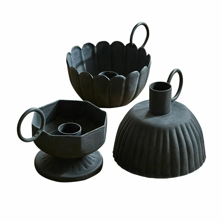 Dieses außergewöhnliche 3er-Set ist ein echtes Statement für Liebhaber individueller Details. Jeder Halter hat seine ganz eigene Formsprache: mal grafisch und kantig, mal rund mit weicher Wellenstruktur oder fein gerillt wie eine nostalgische Backform. Gemeinsam sind ihnen die mattschwarze Oberfläche und der stabile Eisenkörper, der sich angenehm kühl und solide anfühlt. Der angedeutete Tragring verleiht jedem Stück eine klassische Anmutung, fast wie aus einem alten Film. Ob auf dem gedeckten Tisch, im Regal oder auf dem Kaminsims – diese Kerzenhalter schaffen ein ruhiges, fast poetisches Lichtspiel und bringen eine dunkle Note voller Ausdruck ins Zuhause.