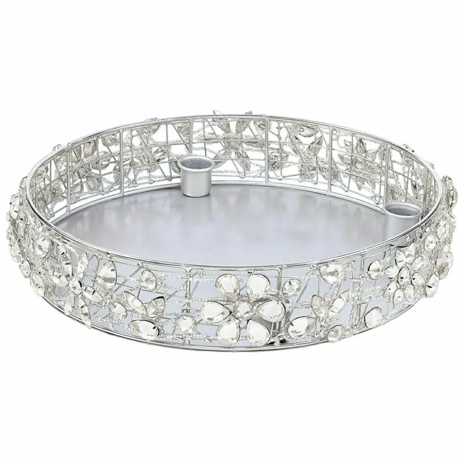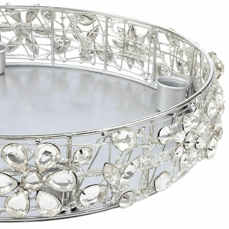 Ein Hauch Glamour zieht mit diesem wunderhübschen Design bei Ihnen ein. Der edle Kerzenhalter aus glänzendem Eisen ist mit glitzernden Glassteinen geschmückt, die besonders im Kerzenlicht herrlich funkeln. Zudem schlingt sich eine Kette um den Rand, die mit kleinen Glasperlen besetzt ist. So glitzert und funkelt besonders der Rand ganz besonders facettenreich. In der Mitte ist Platz für vier Stabkerzen (exkl.). Mit einem zusätzlichen Dorn versehen, halten die Kerzen auf diese Weise sicher in ihrer Halterung. Da die Kerzenhalter sich am Rand befinden, haben Sie in der Mitte genügend Platz für weitere Deko. Das glänzende Eisen ist selbst schon ein toller Blickfang, aber dennoch können Sie hier kreativ werden mit Blättern, Zweigen, Figuren und vielem mehr. Hier haben Sie Platz für Ihre saisonale Deko. So ist der Kerzenhalter ganzjährig eine Freude und kann zur Weihnachtszeit auch als alternativer Adventskranz genutzt werden – eine nachhaltige Variante. Genießen Sie das elegante Design pur oder schaffen Sie zusätzliche kreative Dekorationen – hier sind der Phantasie keine Grenzen gesetzt. In jedem Fall kommt mit diesem Schmuckstück ein überaus ansprechender Akzent in Ihr Heim, welcher jederzeit ein wahres Highlight setzt.