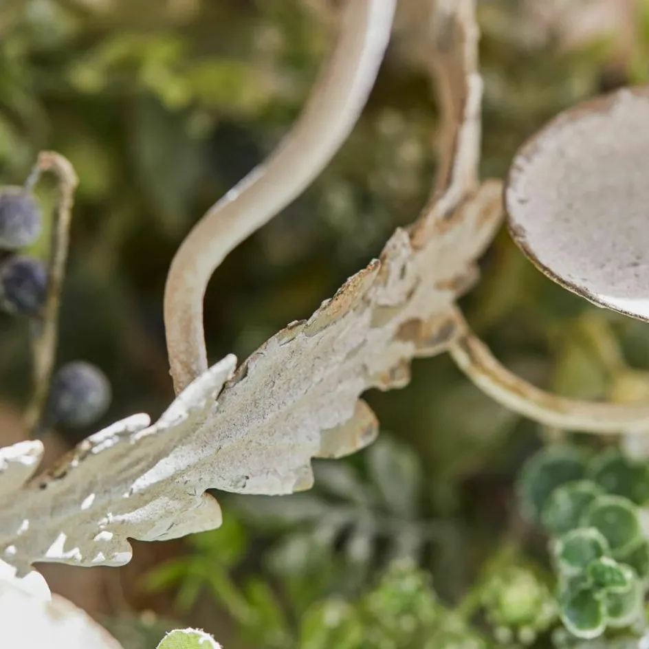 Man spürt es auf den ersten Blick – dieser Kerzenhalter hat Charakter. Sein Eisenkörper ist kunstvoll geschwungen, die sechs Arme elegant nach außen gebogen, und die Oberfläche scheint vom Zahn der Zeit sanft gezeichnet: abgeplatzte Farbe, feine Unebenheiten, Patina in den Vertiefungen. All das ergibt ein Gesamtbild, das an verwitterte Gartendekorationen in alten südfranzösischen Herrenhäusern erinnert. Die zarten Blätter aus Metall, die sich wie ein Kranz um das Mittelstück legen, unterstreichen die romantische Wirkung. Ob auf dem Kaminsims, auf einer gedeckten Tafel oder als festliche Mitte eines Adventsarrangements – dieser Kerzenhalter bringt nostalgische Wärme und rustikale Poesie in Ihr Zuhause.