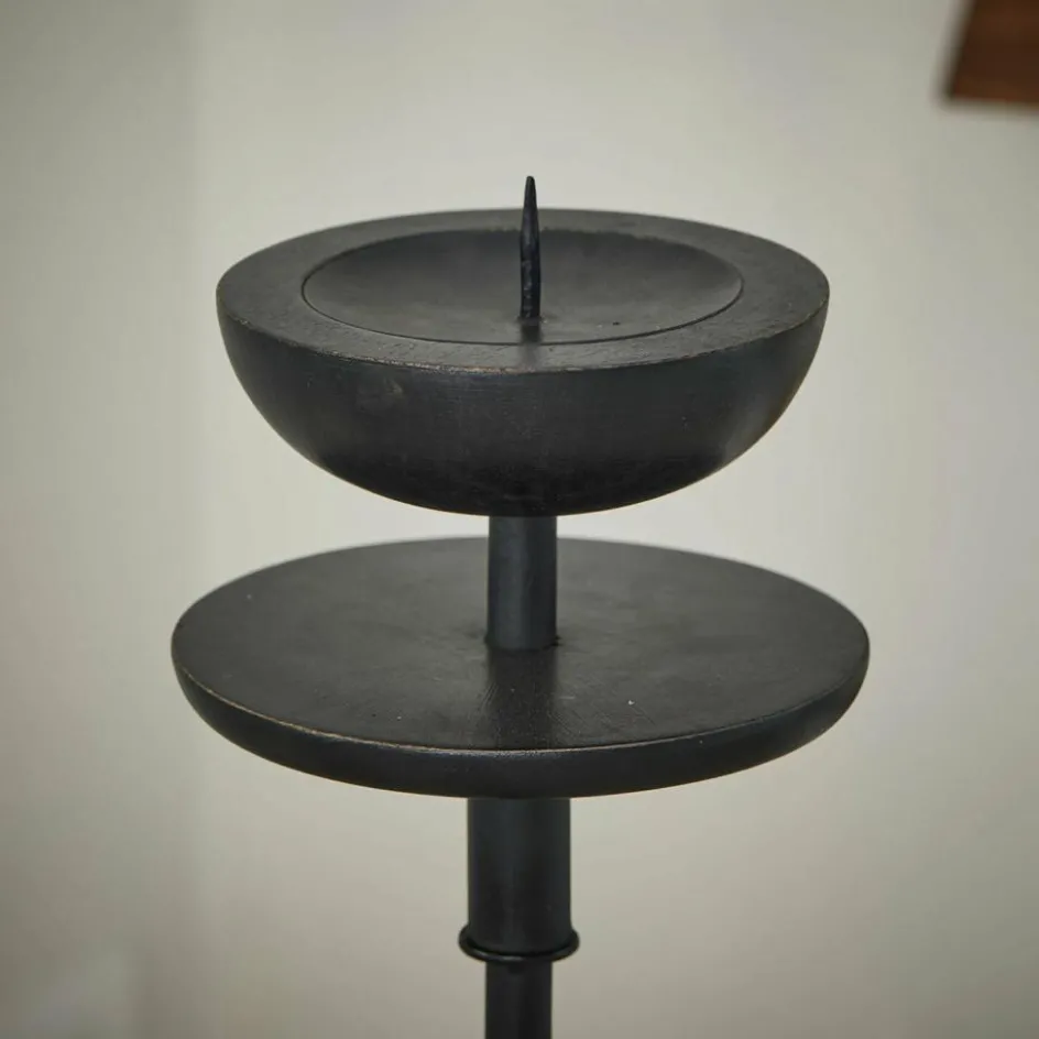 Diese beiden Kerzenständer wirken fast wie stille Wächter im Raum. Ihr kraftvoller Auftritt entsteht durch ihre imposante Höhe, das schwer wirkende Rundfuß-Design und das tiefmatte Schwarz des lackierten Holzes. Die klare Formgebung erinnert an moderne Skulpturen, während die großen Kerzenteller mit Dorn für funktionale Sicherheit sorgen. Ob im Wohnzimmer, Flur oder auf der Terrasse – dieses Duo bringt visuelle Ruhe, aber auch eine starke Präsenz mit sich. Kombiniert mit warmem Kerzenschein entsteht ein eindrucksvolles Spiel aus Licht und Kontrast.