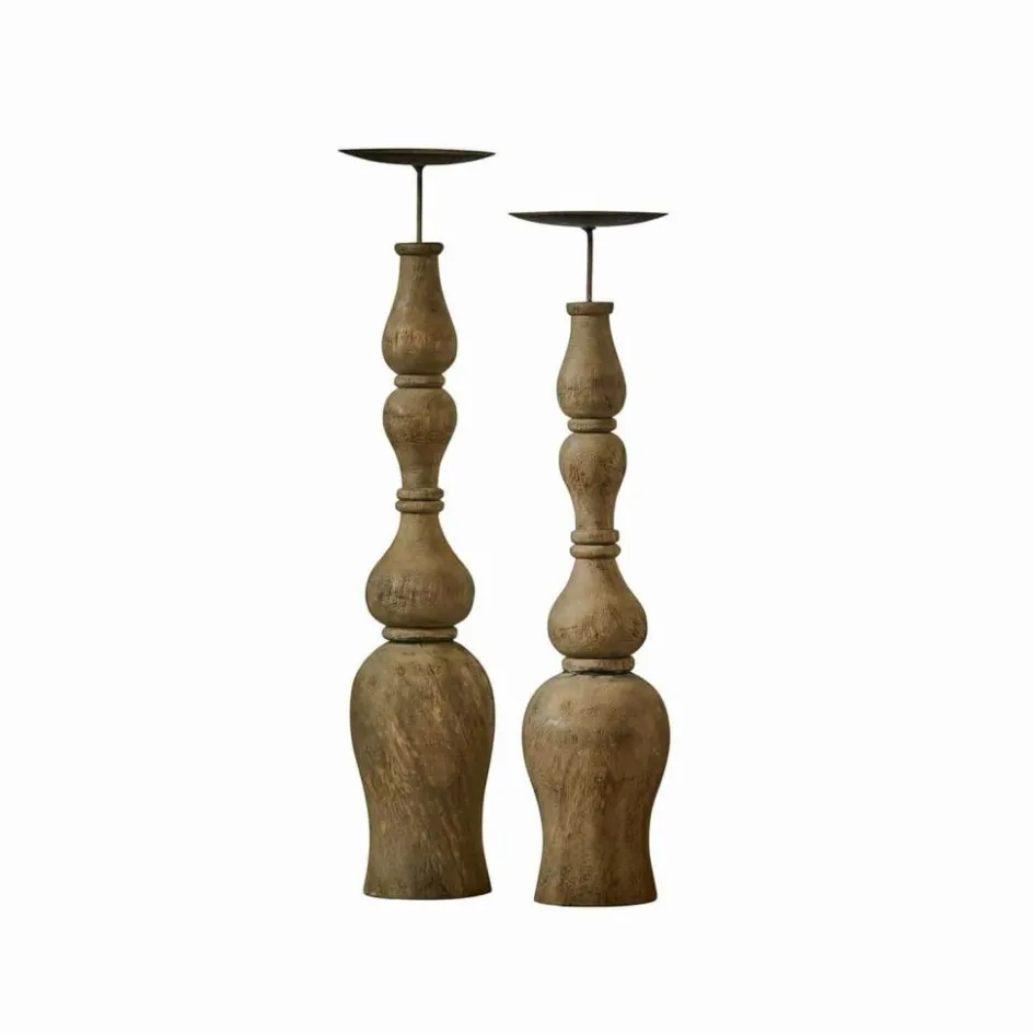 Ein Hauch traditioneller Handwerkskunst zieht mit diesem Kerzenständer-Set bei Ihnen ein. Aus Mangoholz gefertigt und mit viel Gefühl für Form gedrechselt, wirken die beiden Stücke wie kleine Skulpturen. Die natürlichen Farbschattierungen des Holzes geben jedem Stück seinen eigenen Charakter, während die zarte Eisenhalterung für klassische Stabkerzen eine stilvolle Leichtigkeit hinzufügt. Im Zusammenspiel der zwei unterschiedlichen Höhen entsteht ein charmantes Wechselspiel von Form, Licht und Schatten – ideal für festliche Tafeln, den Kaminsims oder eine stimmungsvolle Fensterbank im Advent.