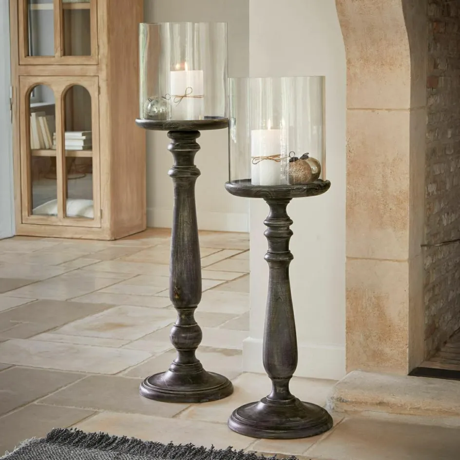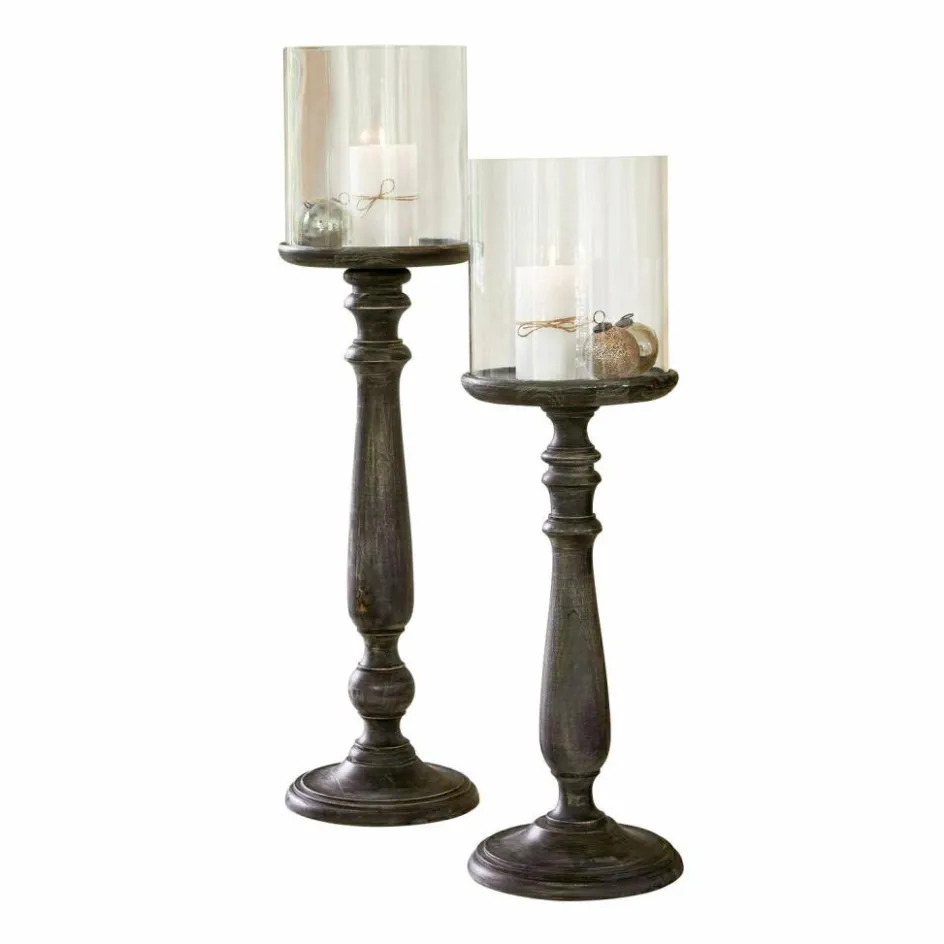 Wenn Licht auf Form trifft, entsteht Atmosphäre. Dieses Set aus zwei majestätischen Kerzenhaltern verbindet filigrane Details mit kraftvoller Höhe. Die schlanken Sockel aus Mangoholz sind kunstvoll gedrechselt und tragen großzügige Glaszylinder – ein Duo, das sich wie geschaffen für ausdrucksstarke Arrangements auf dem Boden, vor Kaminen oder neben Türen zeigt. Das dunkle Finish mit subtilen Gebrauchsspuren verleiht den Ständern Tiefe und eine gewisse Würde – nicht laut, aber eindrucksvoll. Eine Komposition, die klassische Einrichtungsideen mit einer modernen Haltung verbindet und das Spiel von Flamme und Form auf edle Weise in Szene setzt.