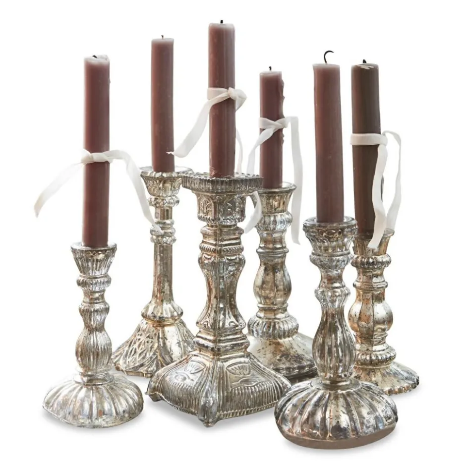 Ein Traum für alle Romantiker: Diese wunderschönen Kerzenhalter wirken wie wertvolle Erbstücke oder charaktervolle Funde vom Flohmarkt. Vintage-Charme pur und einfach perfekt zum Shabby-Chic. Sie bestehen aus Glas, das von außen versilbert wurde. Jeder der sechs stilvollen Kerzenhalter weist ein individuelles und detailverliebtes Design auf. Als Gruppe wirken sie besonders reizvoll, doch auch einzeln gestellt versprühen sie ihren Zauber. Entzünden Sie einfach Stabkerzen darauf und tauchen Sie Ihre Räume in weiches Kerzenlicht. Das ganze Jahr über ein wahres Highlight, das alle Blicke auf sich zieht und für romantische Stimmung sorgt. Tipp: Lassen Sie die Kerze nie ganz abbrennen! Wenn die Kerze noch ca. 1 cm raussteht, lässt sie sich zum einen besser entfernen und zum anderen schont das auch das Glas. Zu viel direkte Hitze kann das Glas schädigen.