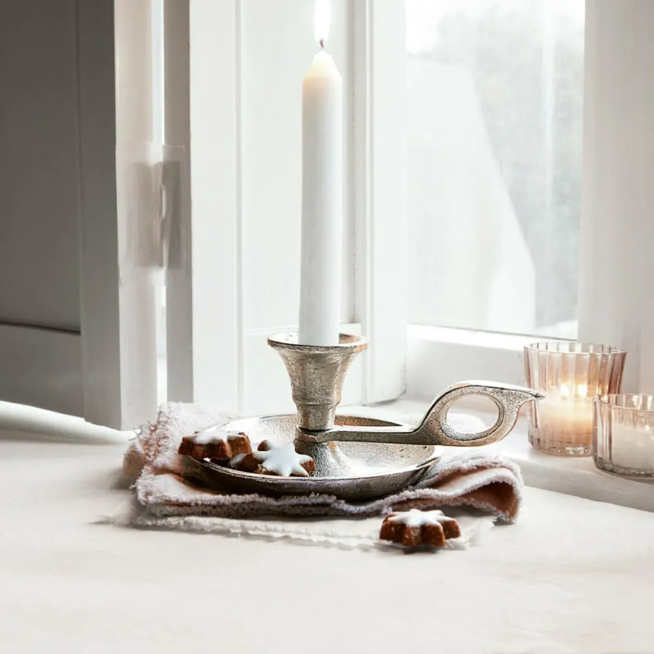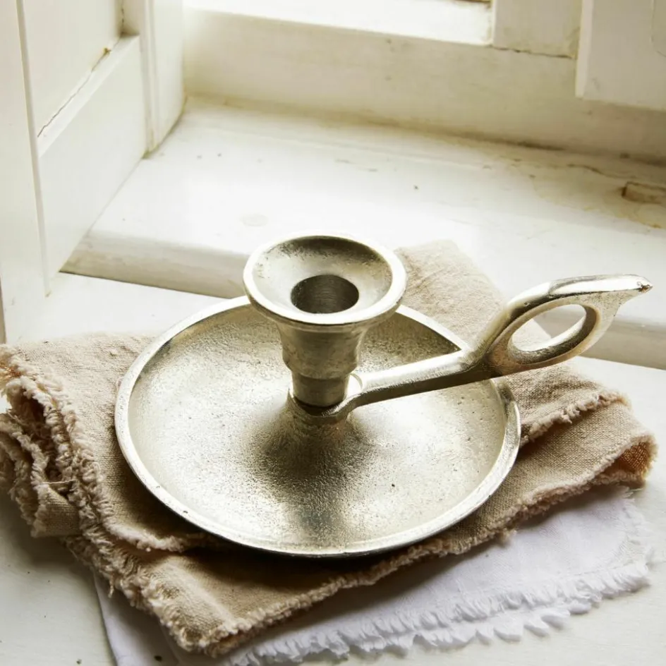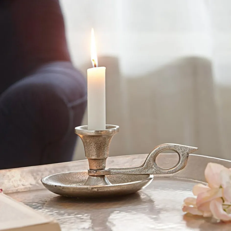 Manche Designs sind seit Jahrhunderten unverändert, weil es daran einfach nichts zu verbessern gibt: Ein perfektes Beispiel dafür ist dieser klassische Kerzenhalter mit Griffring und Tropfschale. Er hat schon unseren Vorfahren gute Dienste geleistet, als man nicht einfach den Lichtschalter betätigen konnte, um Nachts vom Schlafzimmer ins Badezimmer zu spazieren. Hergestellt wird das antiksilberne Stück übrigens im Aluminiumgussverfahren.